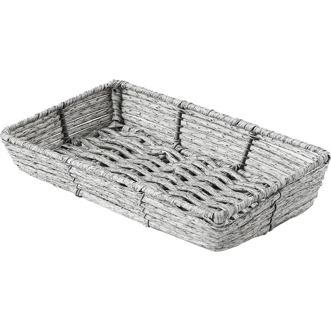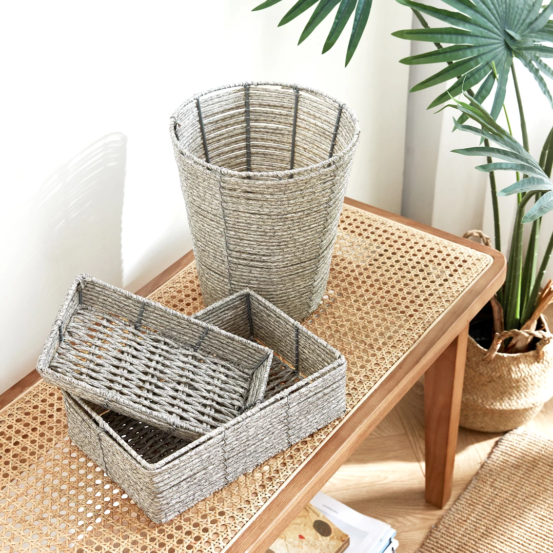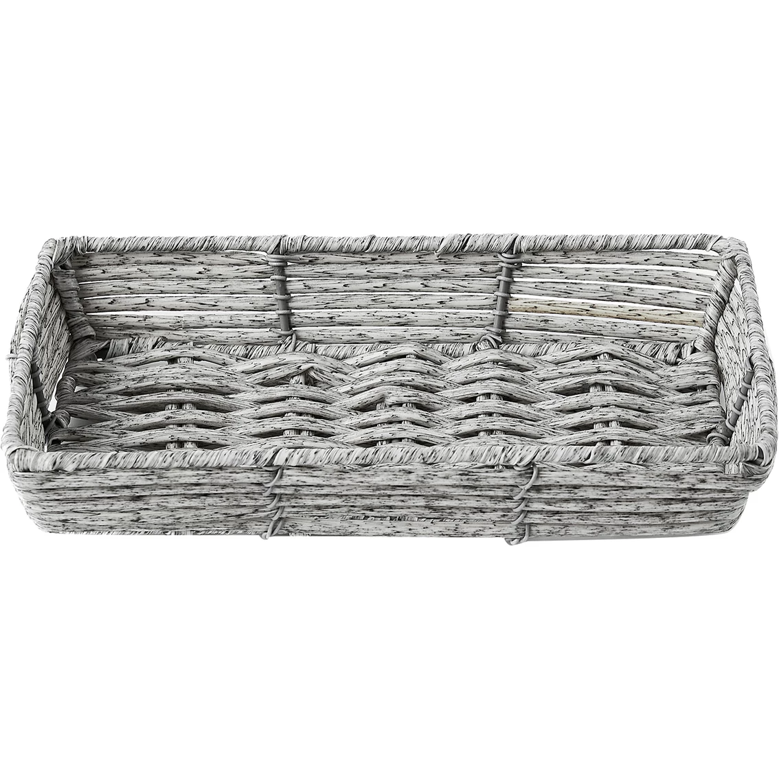 This Set of Three Aurora Binded Faux Wicker Vanity Storage by Baum Essex includes a waste basket and two trays composed of a durable, beautifully constructed grey faux wicker. This set provides a stylish solution ideal for every season and nearly every dรฉcor.