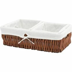 Help organize your home with this Set of Three Hand Woven Willow Baskets in Espresso color from Baum Essex. The set Includes a Sweater Basket and two Shelf Baskets. The Baskets are lined with ecru poly cotton. Great for organizing closets or counters in any room.