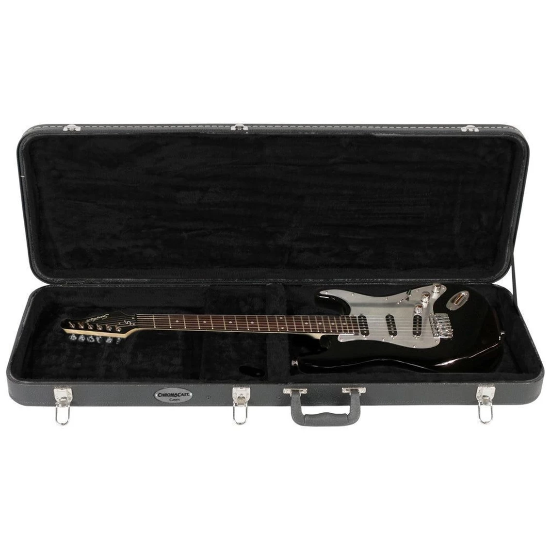 Lockable wood hard case with plush lined interior that includes extra neck and bridge padding