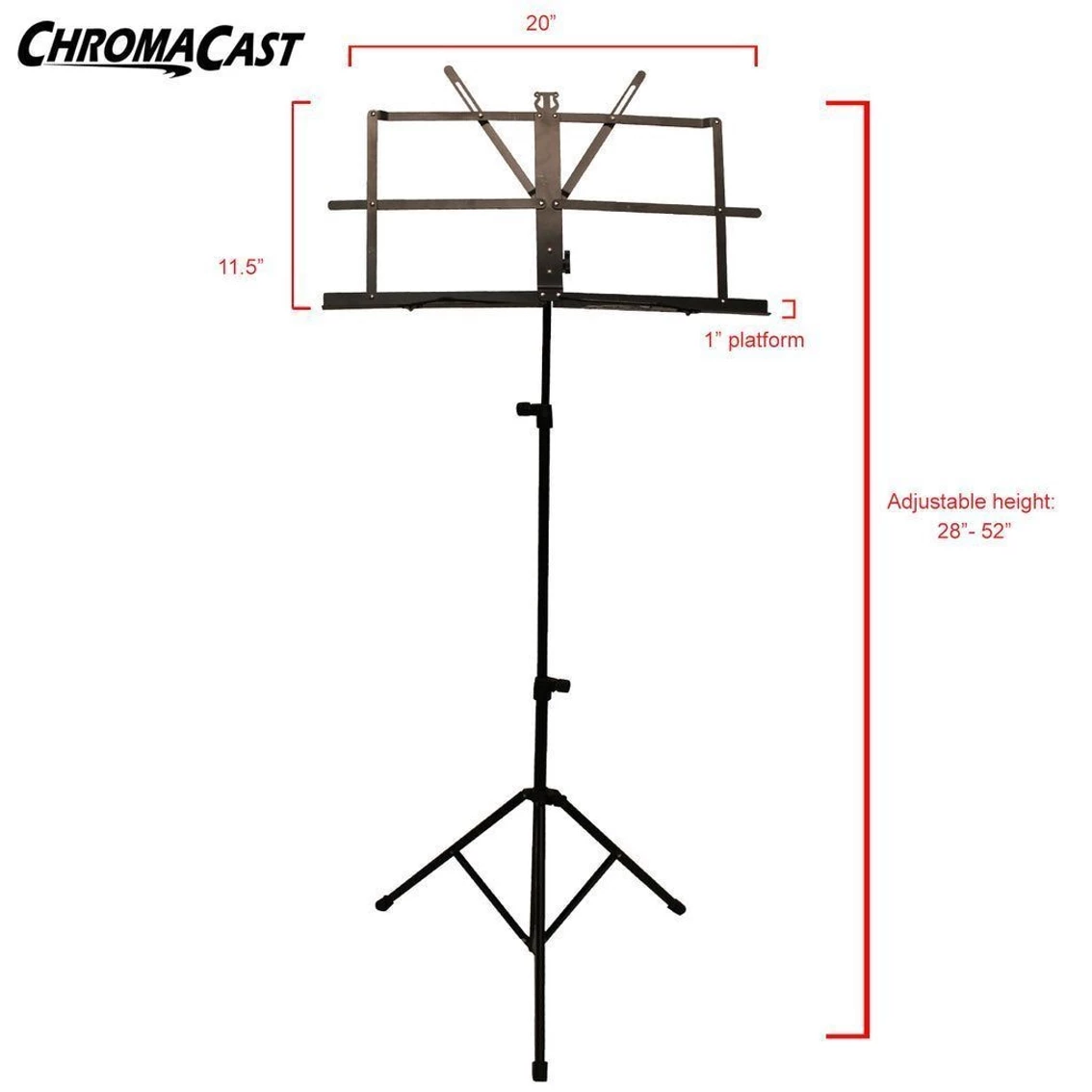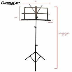 The ChromaCast music stand folds fast for easy storage and portability. The two tier vertical shaft, and tilting bookplate makes this stand perfect for sitting or standing. Height adjusts from 28″ to 52″. Metal spring arms can hold 8.5 x 11-inch music sheets or thin books. Folds up for easy transport. ChromaCast products are designed by musicians for the active player, and provide the best in affordability and quality.