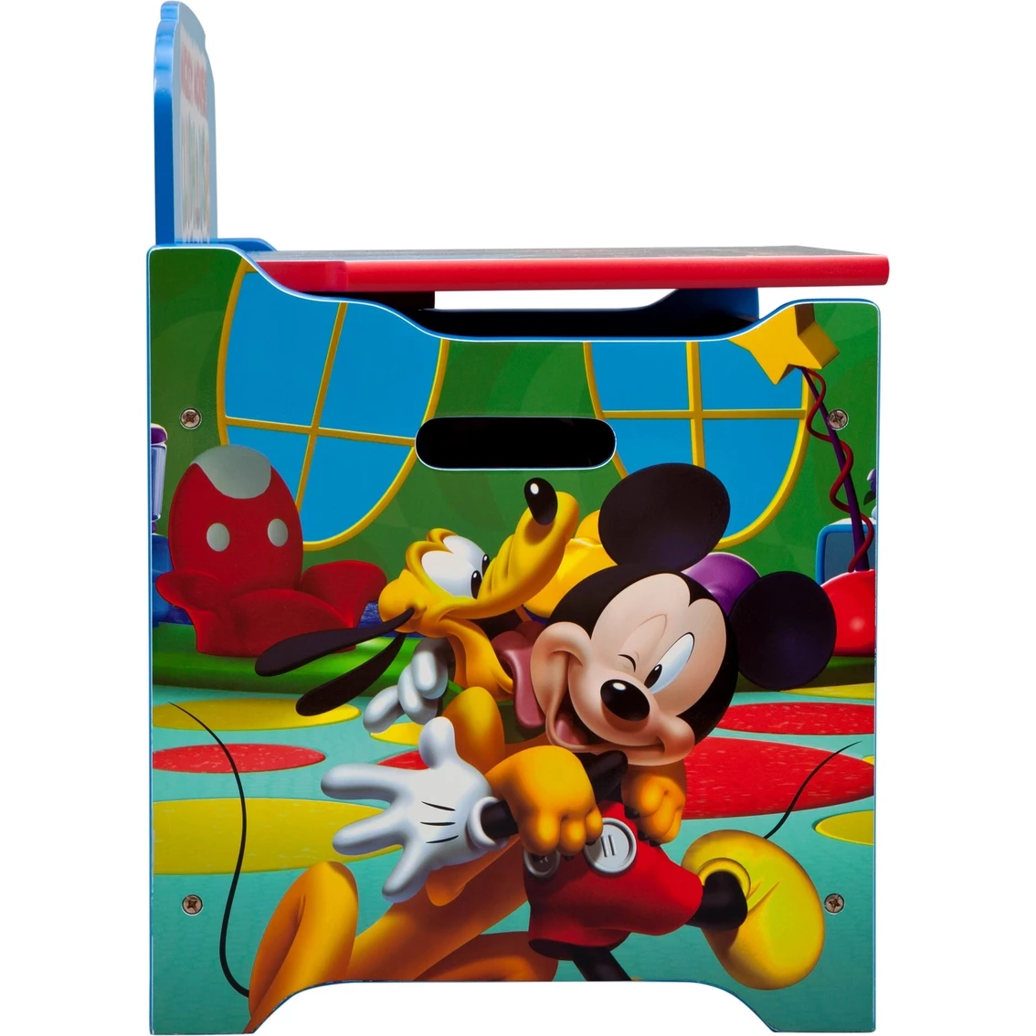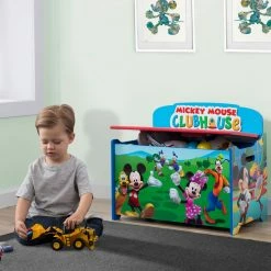 Keep their room clean with this Disney Mickey Mouse Deluxe Toy Box. Featuring colorful graphics of everyone’s favorite mouse, plus durable wood construction, it’s designed with rounded corners, smooth edges and a slow-closing lid for safety. Recommended for ages 3+ Made of engineered wood, it features slow-closing lid with safety hinge, rounded corners and smooth edges. This box is durable and easy-to-clean finish. The scratch-resistant finish protects the colorful graphics. Meets or exceeds all safety standards set by the CPSC. Assembled Dimensions: 23.5 in. x 21.5 in. x 14.5 in. Model: TB84955MM.