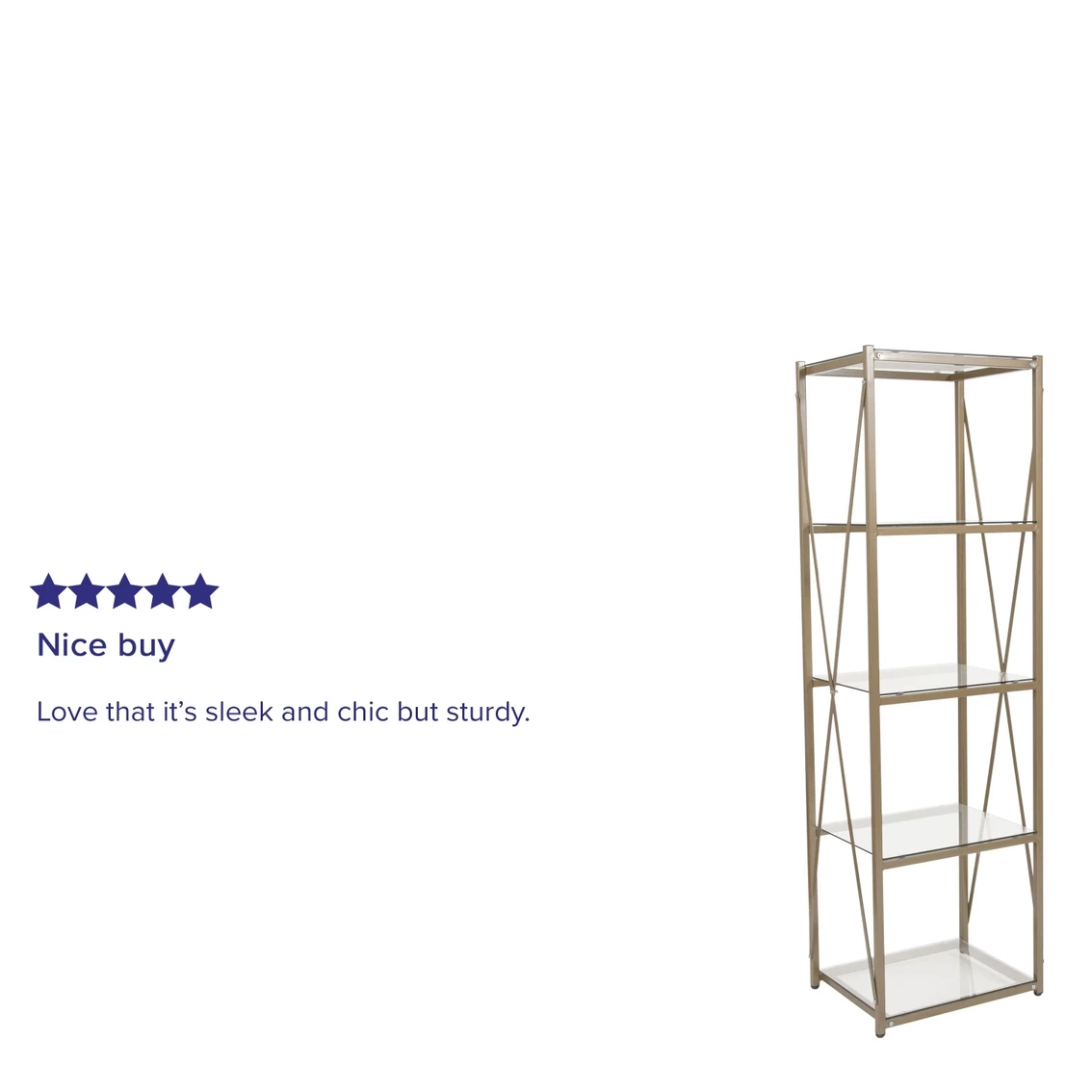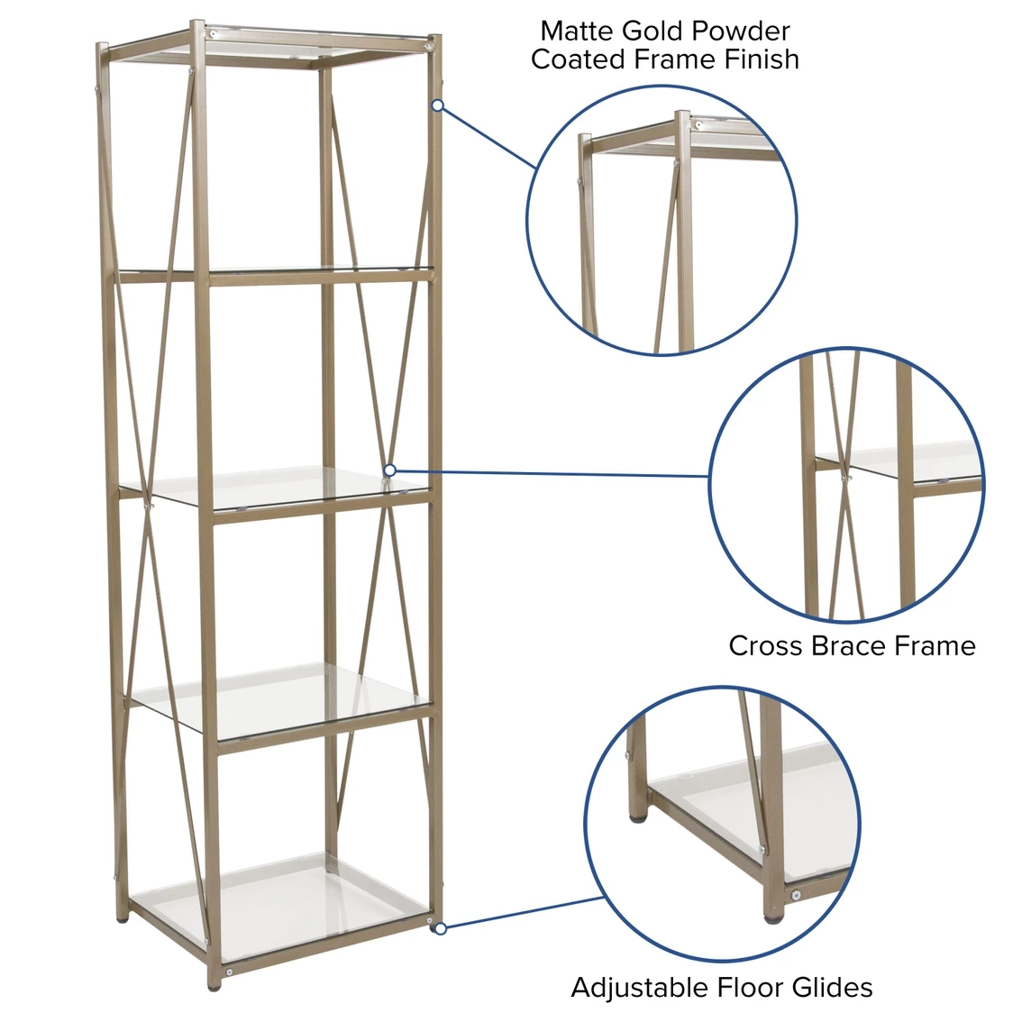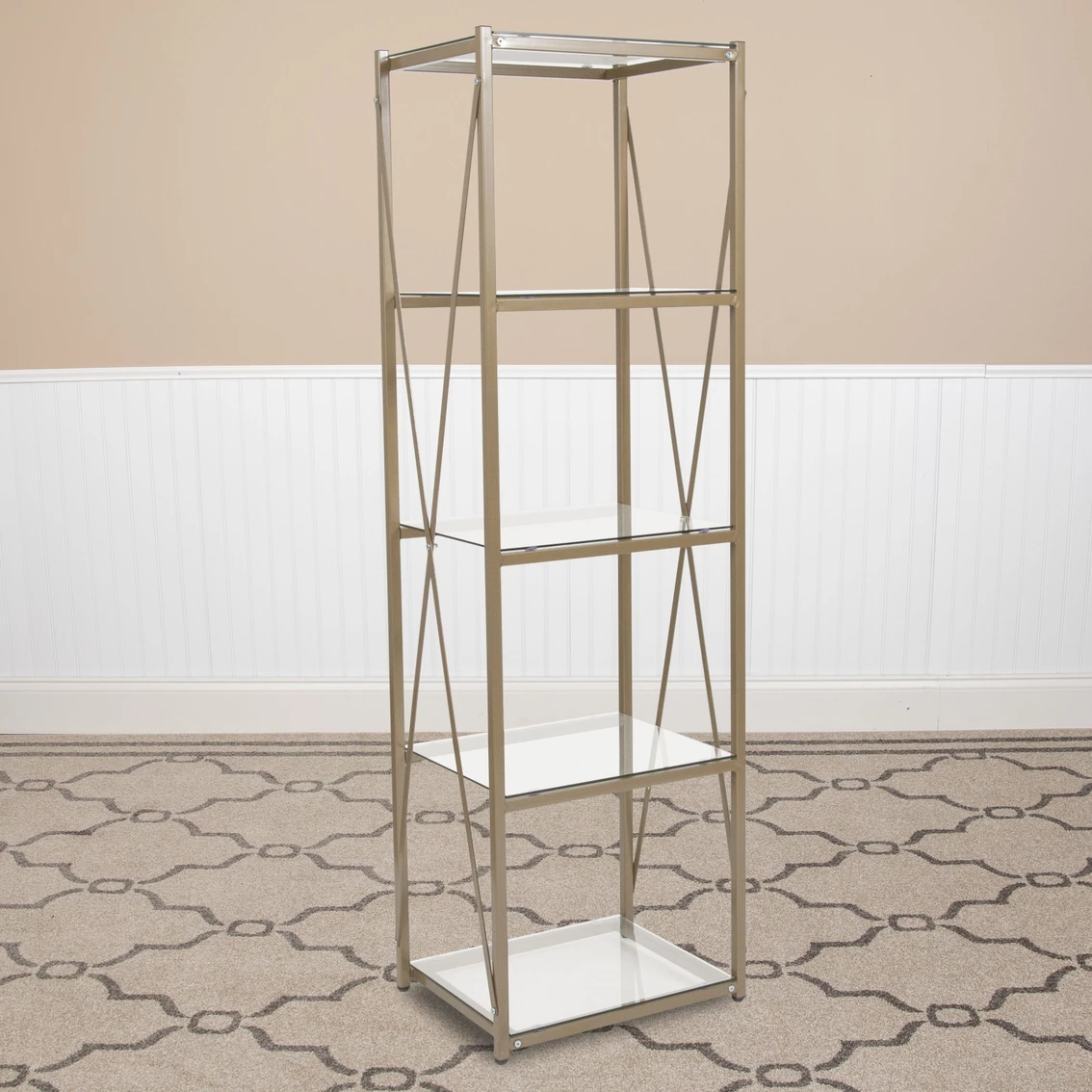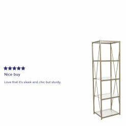 Keep your entryway or living room organized with this 4 shelf bookcase. Display your decorative items, and photos on this stylish shelving unit. Clear tempered glass shelves will brighten up your space. The designer cross frame enhances the beauty with a matte powder coated frame finish. This versatile piece can be used anywhere in the home to meet all your display needs. Adjustable floor glides help keep this bookshelf level and protect floors as well.