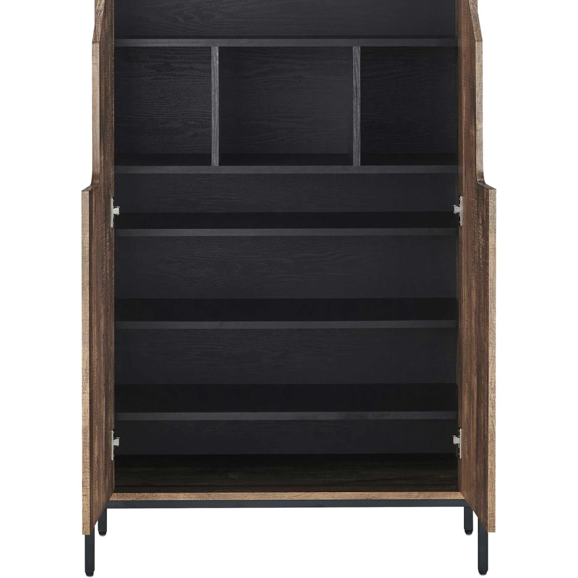 The reclaimed oak wood Furniture of America McCarran Rustic Wood 8-Shelf Shoe Cabinet is ideal for storing footwear, toys, sports equipment and more in your stylish entryway or mud room. Features eight varying shelf spaces that easily host everything from shoes to bags to winter accessories. The unique, geometric brown cabinet door design allows you to keep a few items within easy reach and on display while concealing the rest. Model: FGI-1869C25.