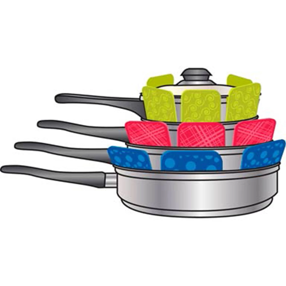 Made of Polypropylene Felt (PPFelt), these cookware protectors protect nonstick coatings. Perfect for cookware, stoneware, bakeware, serving dishes and more. Three convenient sizes, 18 in., 16 in. and 14 in. Decorative design helps resist sliding while stacking. Three bright colors and designs add fun to storage solution. Not oven safe.