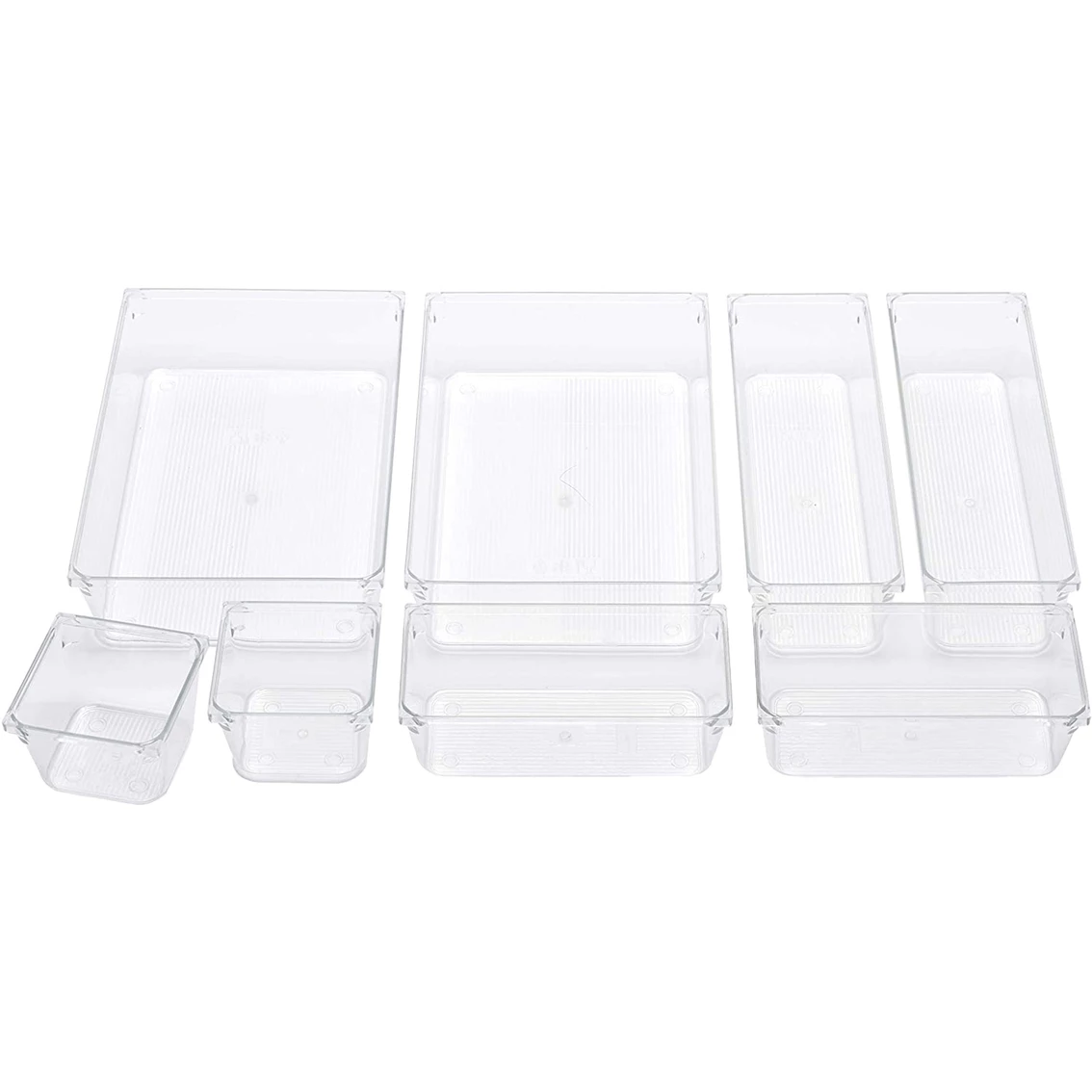 The Real Home Clear 8-Piece Drawer Organizers are made of PET, a clear, strong and lightweight plastic. These can be placed in your drawers in the direction and combination that works for you. Great for kitchen, bathroom & office drawers, craft rooms, playrooms and garage drawers. Enables you to arrange items neatly and keep everything easily visible and accessible. Organize your junk drawer, silverware, office supplies, cosmetic, makeup tools, hair accessories, jewelry, toothpaste, hairbrushes, medicine and more. 8-Pieces include 4 different sizes including 2 Extra Small (2.95 x 2.95 in.), 2 Small (2.95 x 5.91 in.), 2 Medium (2.95 x 8.86 in.) and 2 Large (5.91 x 9.14 in.). Every bin is 1.97 in. tall. Easy to clean with a damp cloth. Real Home Innovations, “Making Life Simple”. Model: 009-09393.