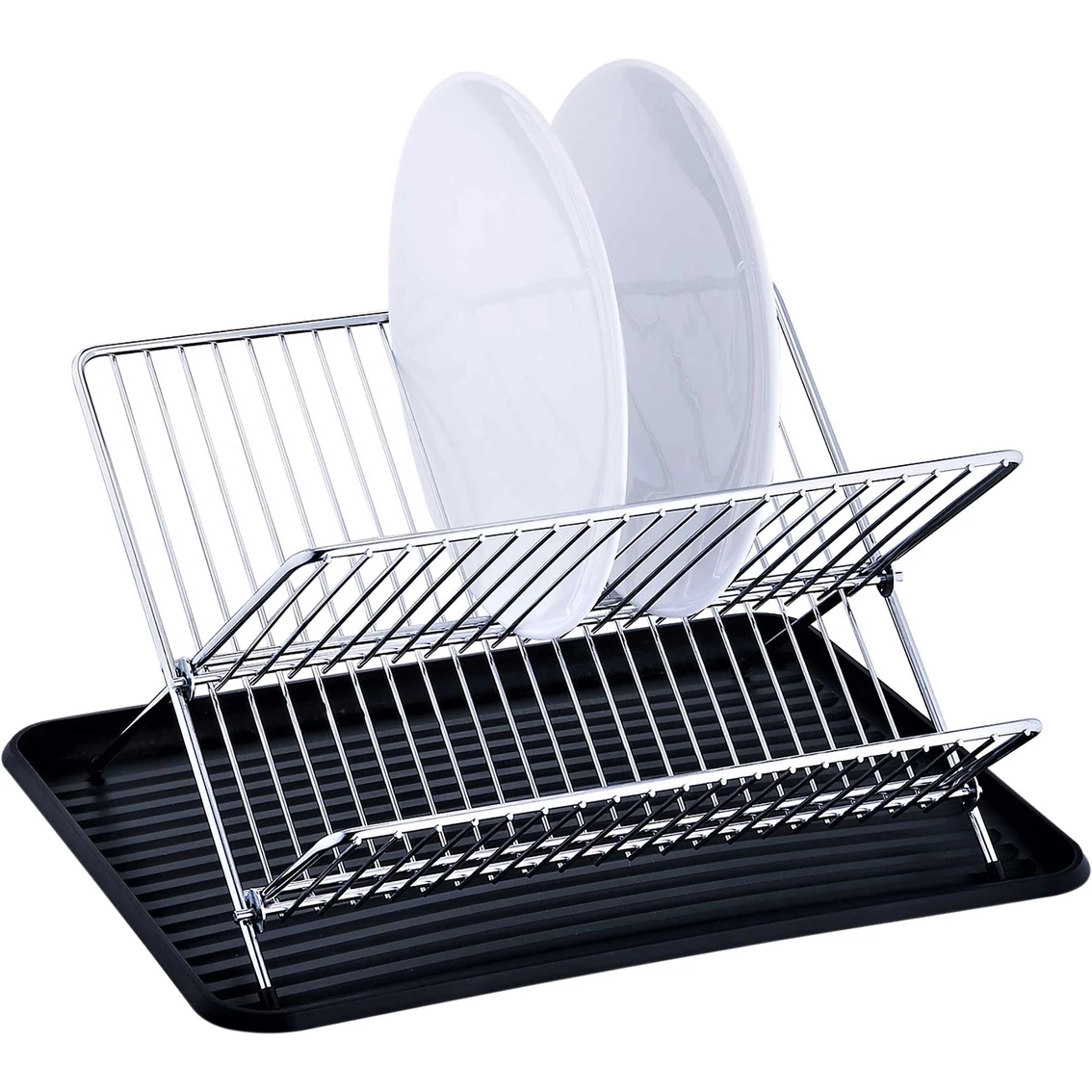 Real Home 009-09164 Chrome & Black Folding Dish Rack Set . Includes: 2-tier dish rack stand and a plastic drain board. Compact size makes it perfect for kitchens with limited counter space. Folds flat for simple storage. Our dish drainer neatly organizes dishes after they have been washed. Made with chrome finish wires that combines elegance with functionality. Use the drain board to prevent water from dripping on your counter while your clean dishes are drying. Protects china and glassware from scratches and other damage that can happen during hand drying, or when not lifted off of the countertop surface. Dimensions: 14.17 in. W x 12.20 in. D x 8.46 in. H. Model: 009-09164.