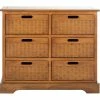 The British Colonial inspired Jackson two-drawer storage cabinet in cream finished pine offers a relaxed vibe and generous storage with its amber-toned cane baskets with cutout handles for easy access. Some assembly required. Model: AMH6503A.