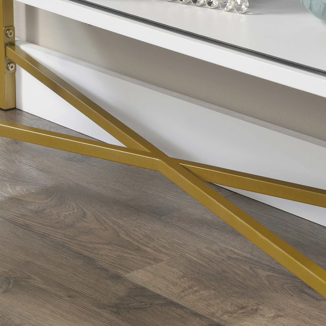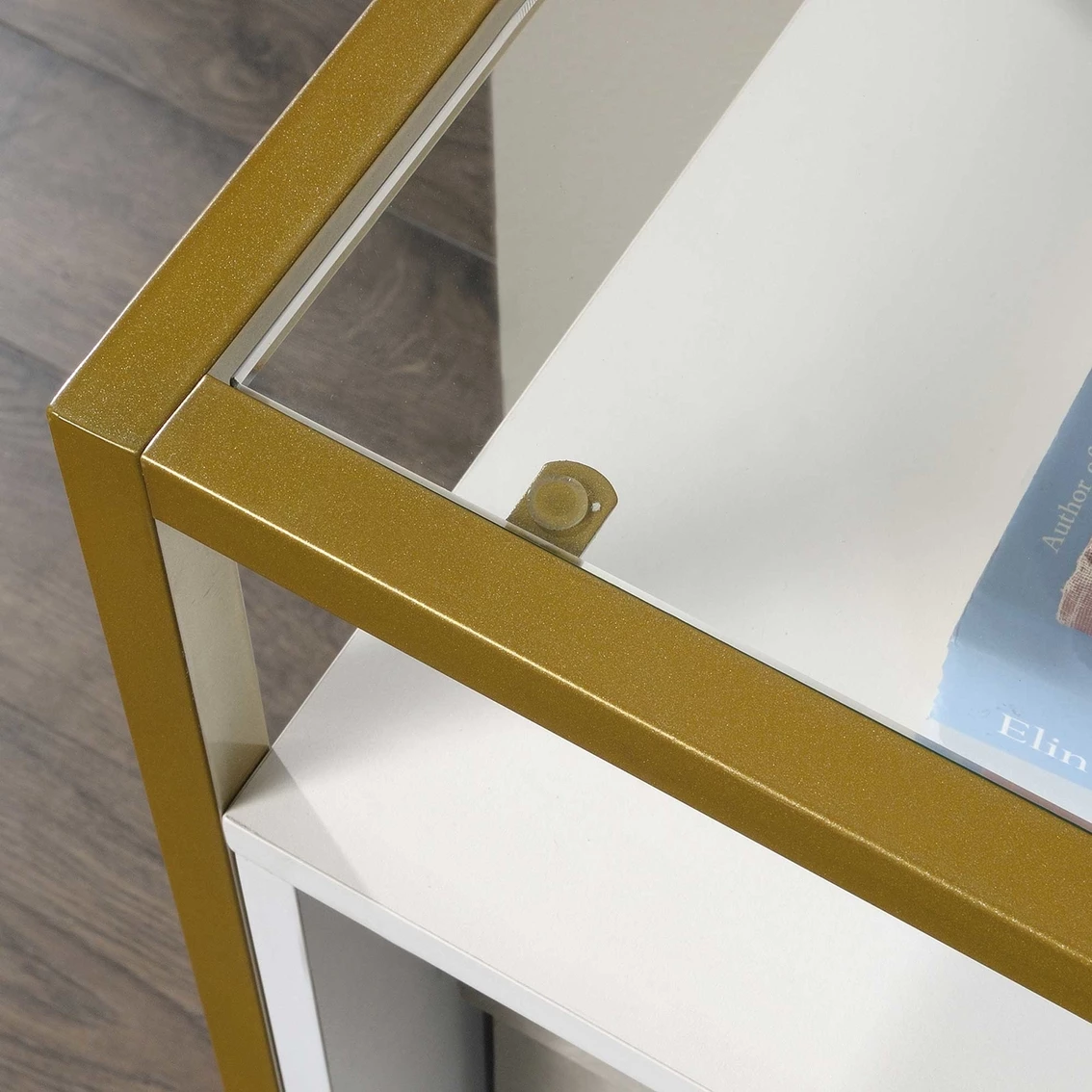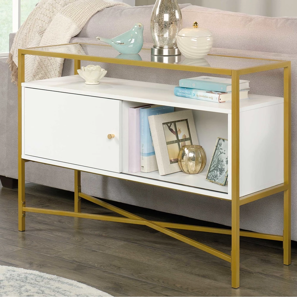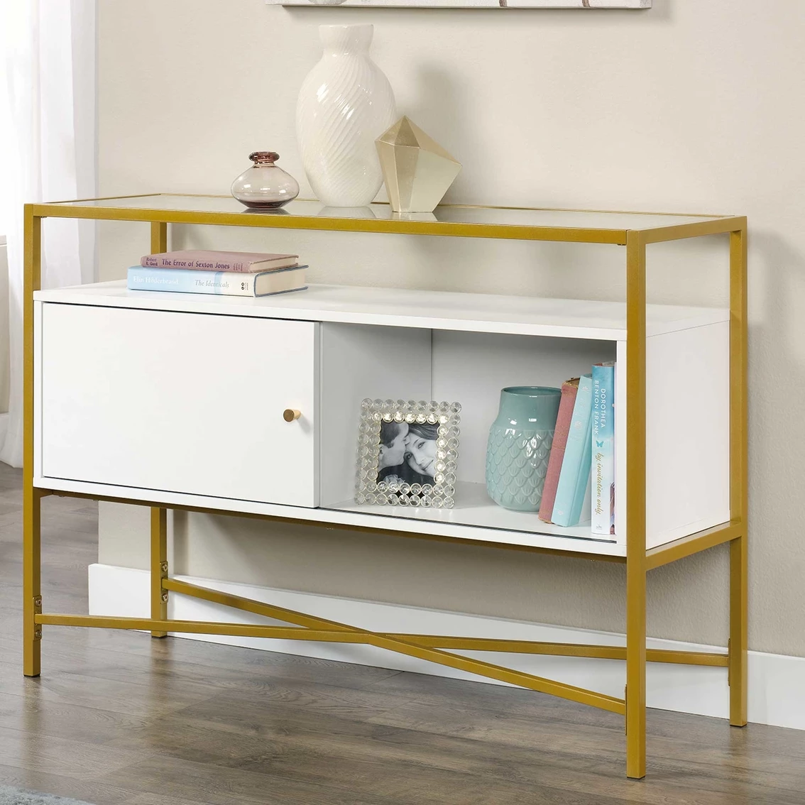 Is your home decor looking a bit boring and bland? Add a touch of sophisticated style and design to your home with this accent storage table from the Sauder Harper Heights collection. This metal and wood accent table features a safety-tempered glass top with space to display home decor items like plants, a tabletop lamp and framed photos of your family and friends. Table has an open shelf with sliding door below its top surface so you can display the best and hide the rest. Conveniently stow away items like your collection of books and magazines or display knick-knacks and awards. This contemporary table is accented with a durable, gold powder-coated metal frame that is sure to stand out in your home. Finished in white, this table with storage is just what your home is missing.