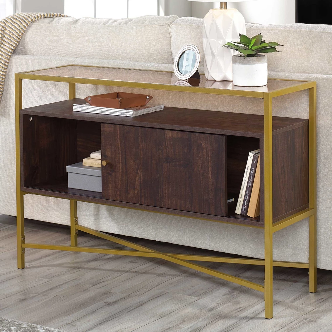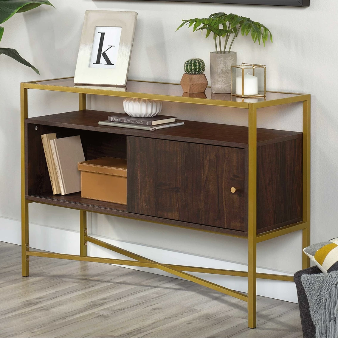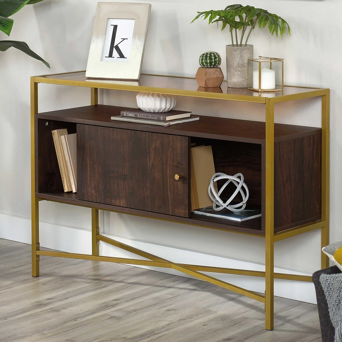 Want to add a touch of sophisticated style and design to your home? This accent storage table from the Sauder Harper Heights collections is just what you need. This metal and wood accent table features a tinted, safety-tempered glass top that provides space to display home decor items like decorative plants, a wireless speaker and framed photos of your family and friends. The contemporary accent table includes additional storage beneath the glass top surface with a sliding door so you can display the best and hide the rest. This table with storage is accented with a durable, gold powder-coated metal frame that is sure to catch the eye of all your guests. Finished in Rich Walnut, this stunning glass top accent table is just the piece to give your space some pop.