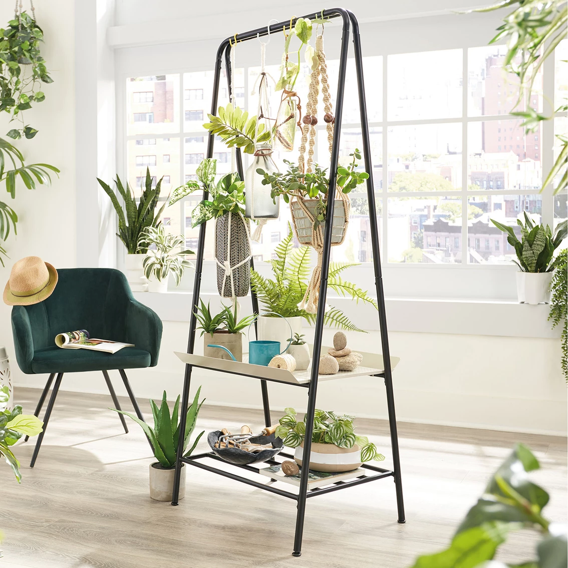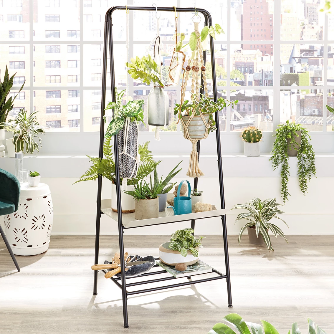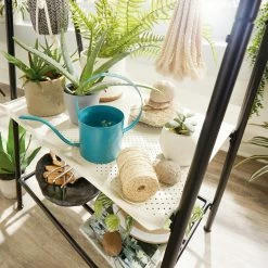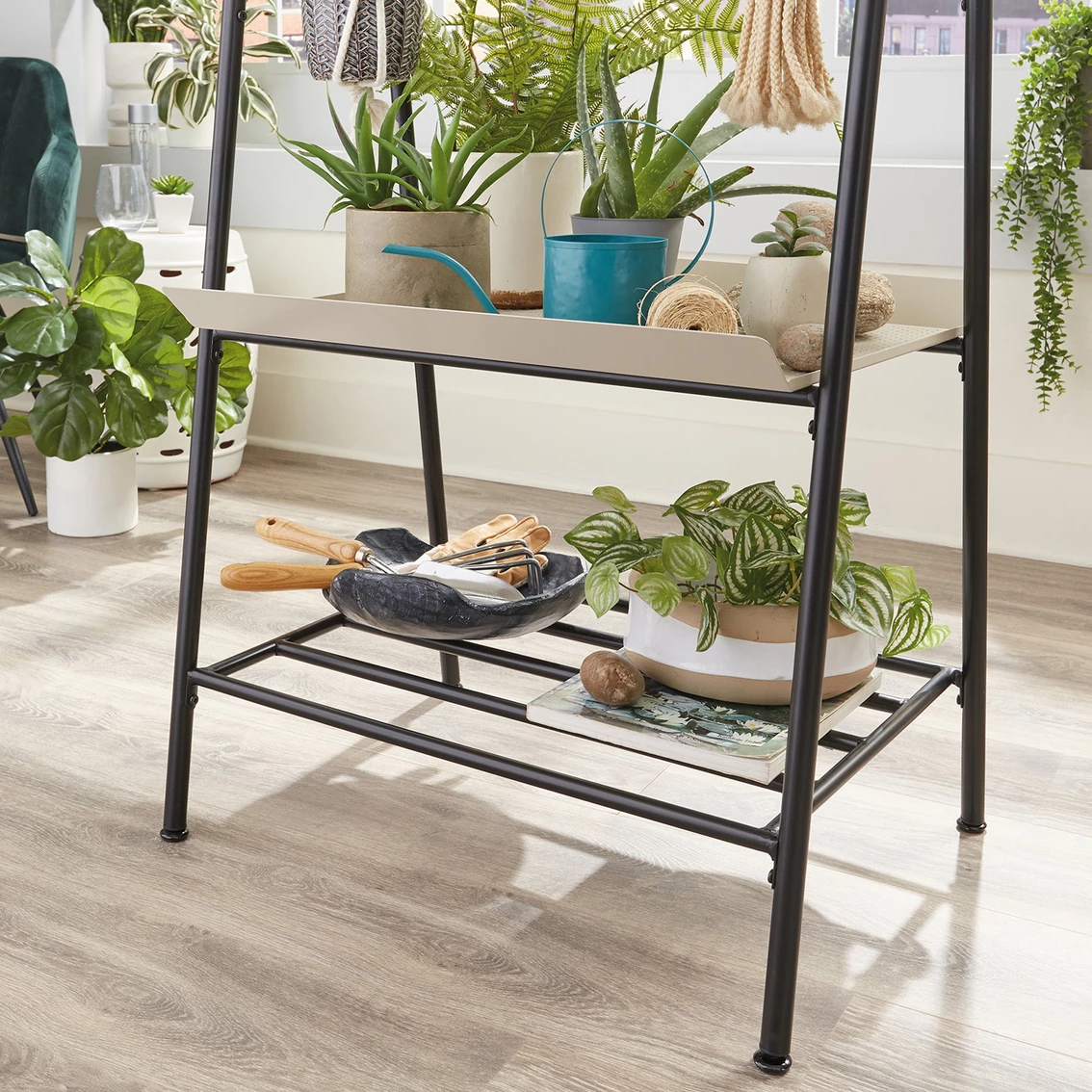 Plant lovers rejoice! Find a place for all your favorite plants, big or small, on this two-tier Sauder Plant Stand from the Boulevard Cafe collection. This multi-purpose shelving solution features a top rod for convenient storage of all your most beautiful hanging plants. It also features a bent metal tray that is ideal to display an array of greenery or store gardening supplies like pots, shovel, and top soil. Need more storage space? No worries. The lower open shelf provides you with the additional space needed for all your other supplies. Its durable, powder coated metal construction ensures that this sturdy stand will be able to hold all your plants. Its multipurpose design allows this stand to be used for more than just plants though. Use it in the hallway, entryway, or any room in your home! Finished in Black, this A frame metal plant stand is everything your home needs and more! Model: 423676.