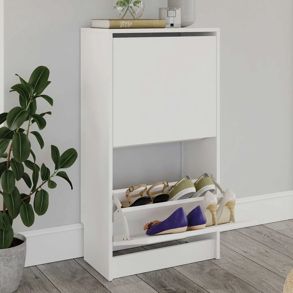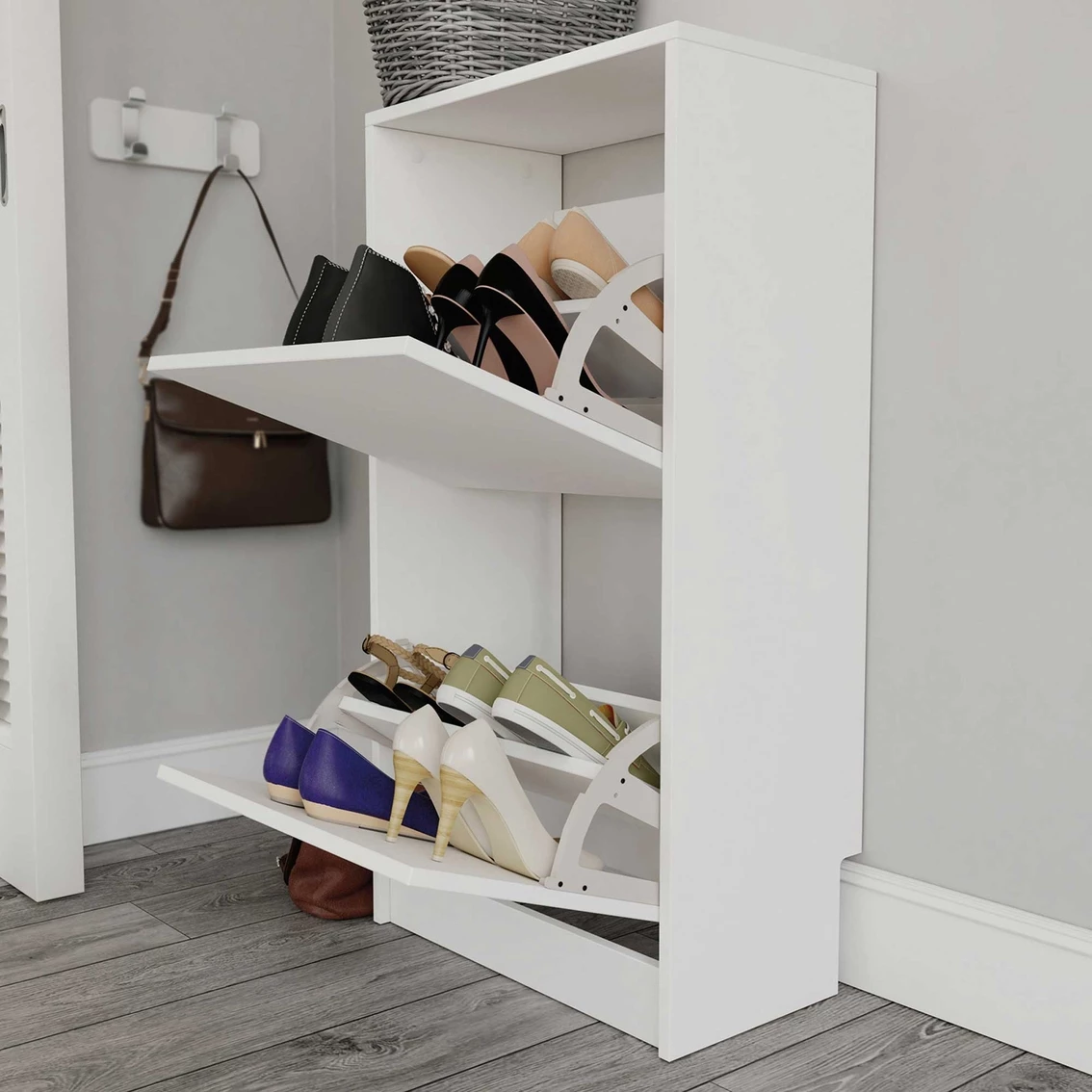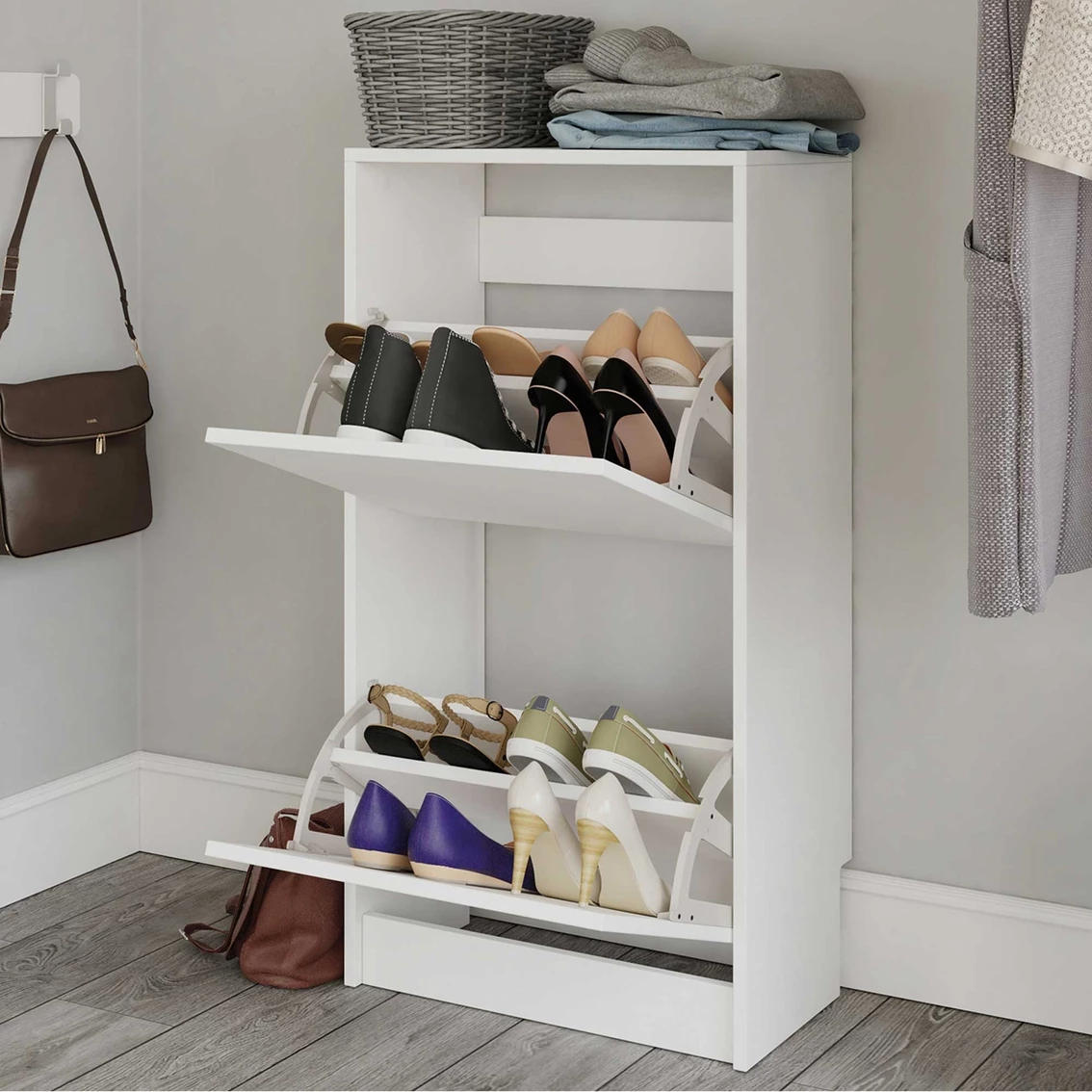 Store your shoes conveniently and subtly with this Sauder Shoe Storage Cabinet with Compartments from the Sauder Select collection. This storage cabinet for shoes features two tiltout doors that conceal shoe storage compartments. This shoe cabinet with compartments includes an adjustable divider to keep your sneakers, heels, or dress shoes organized and easy to find. The vertical design of this tilt-out shoe storage cabinet saves floor space while providing better organization for shoes of various sizes. Perfect for the entryway, hallway, or bedroom closets, this shoe storage cabinet will tidy even the messiest pile of shoes. Finished in a crisp White, this shoe organizer for closet has looks that will blend in, with design that stands out. Sauder designers travel the world and bring back the best and latest in style, finish, and color trends. This inspiring world travel is evident in the cutting edge and innovative furniture solutions they offer to you! Model: 428220.