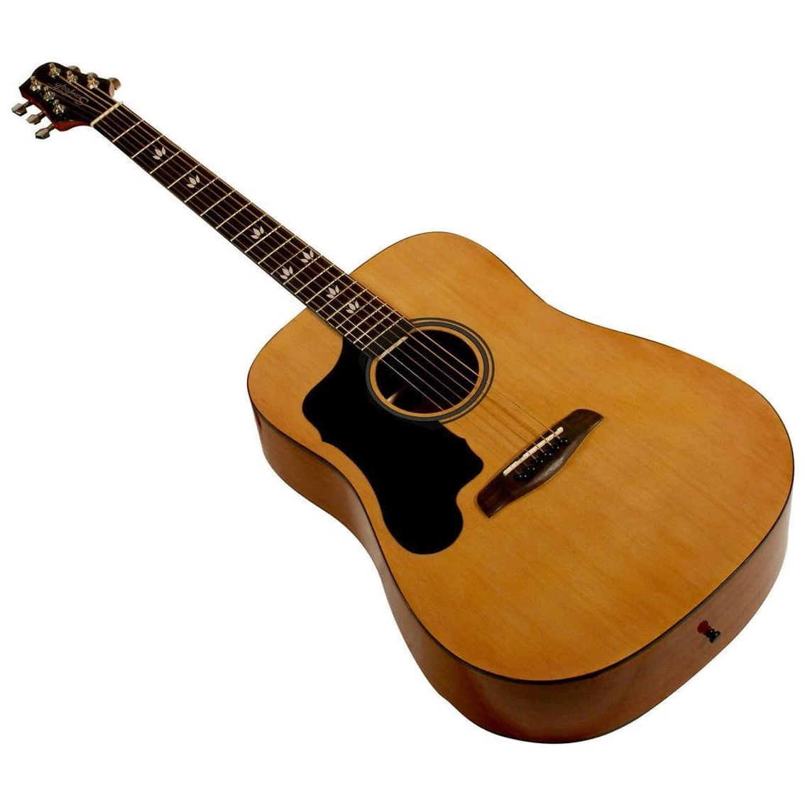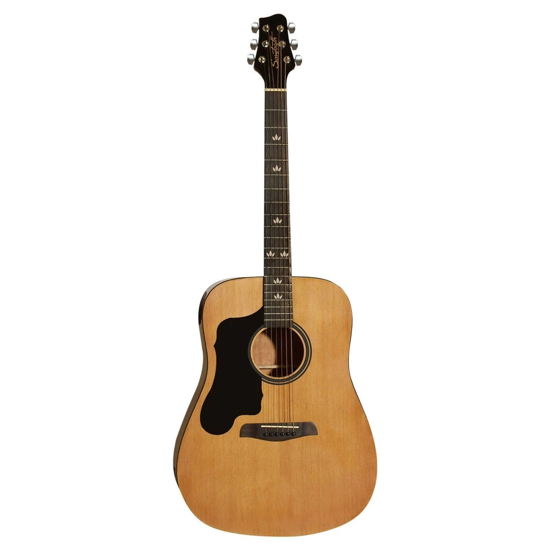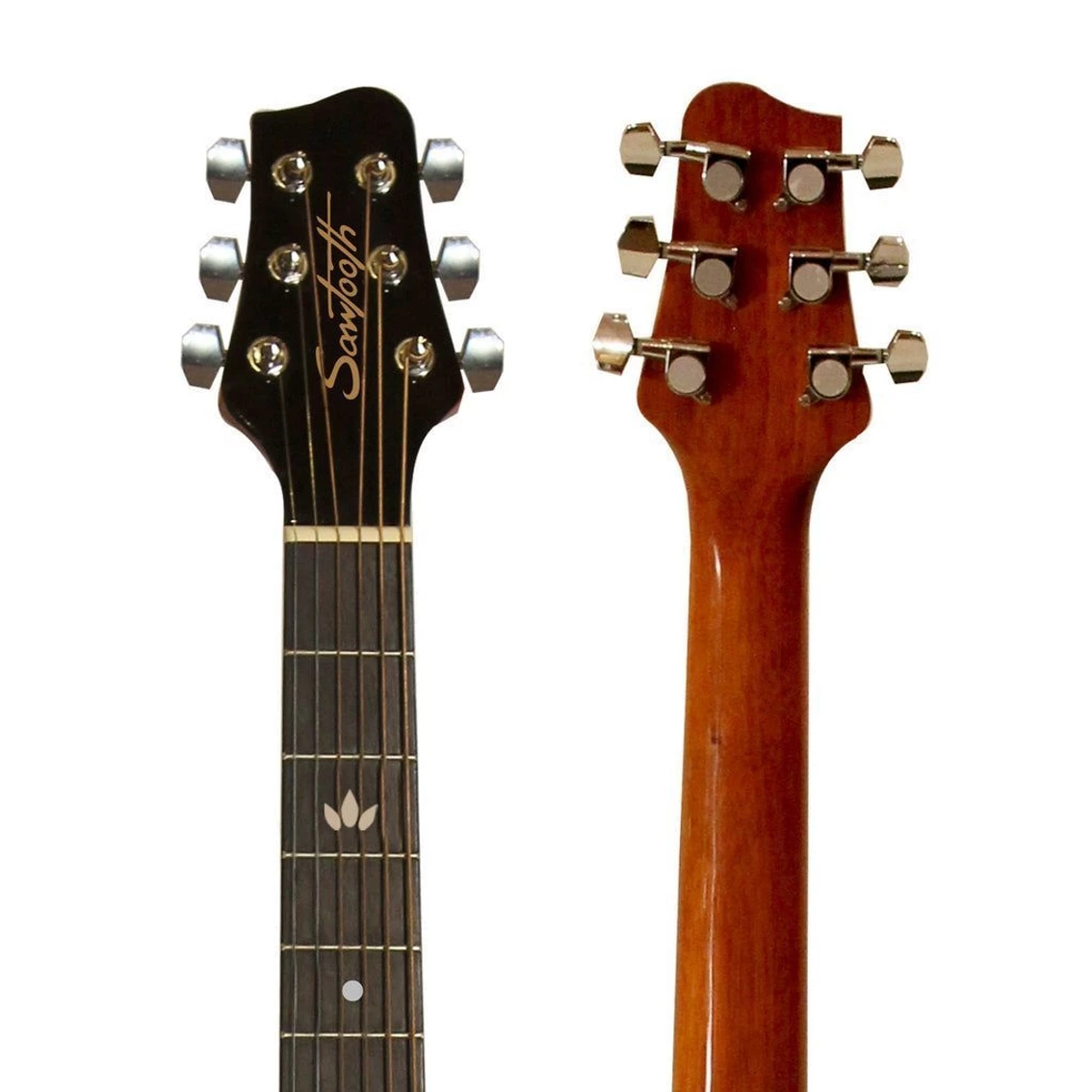The Sawtooth full size dreadnought acoustic guitar offers rich sound and tremendous value to all aspiring guitarists. Great for any player seeking a well-built and easy-playing acoustic guitar. Features a Spruce top with Mahogany back and sides for full and resonant sound, custom pickguard shape, smooth-playing 20-fret rosewood fingerboard, chrome hardware and rosewood bridge.