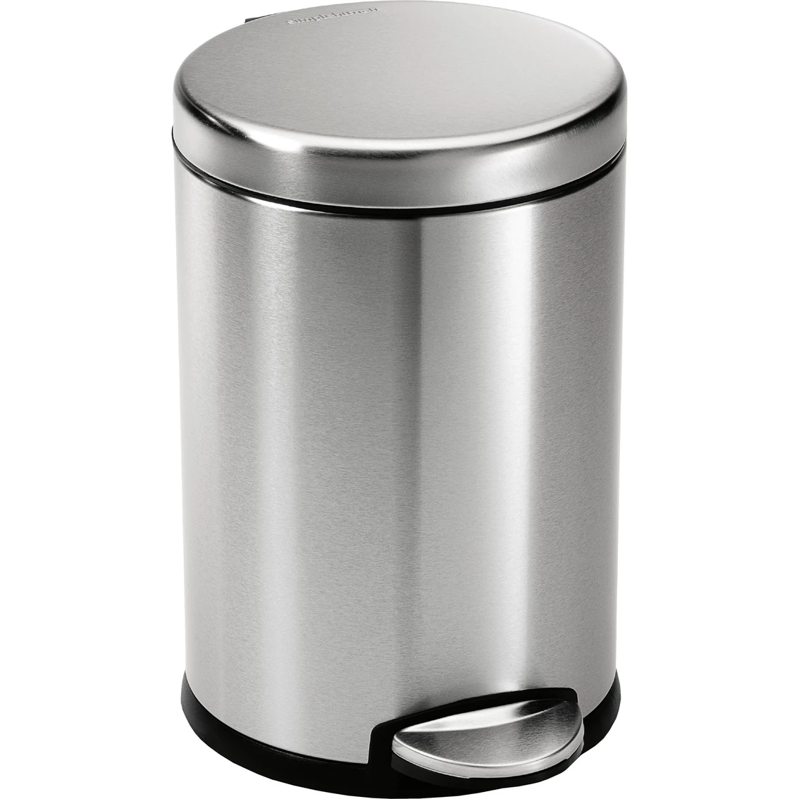 This simplehuman compact classic round step trash can is perfect for smaller spaces like a bathroom or an office. It features a durable steel pedal that opens the lid smoothly, and a removable inner bucket for easy trash disposal. Material: Stainless Steel. Model: CW1852.