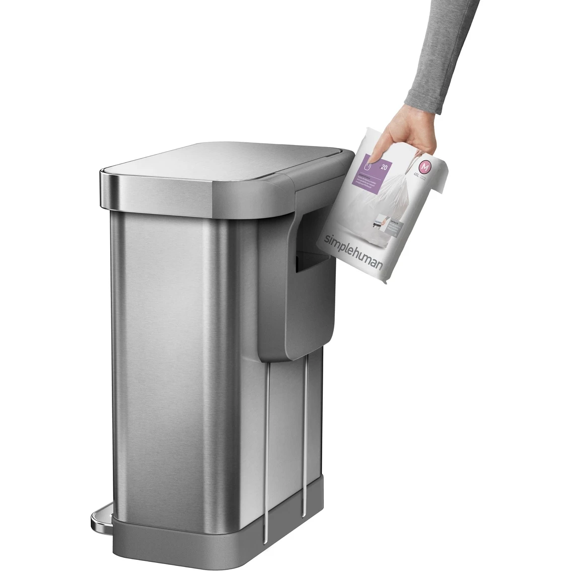 This new stainless steel rectangular step can features an innovative liner pocket that stores and dispenses liners from inside the can for a faster liner change. The stainless steel liner rim grips the liner and keeps it hidden. And with no inner bucket, there’s more space for trash. Strong wide steel pedal is designed to last, and the patented lid shox technology ensures a smooth, silent close every time. Code M liner refill packs store perfectly in this can’s liner pocket.