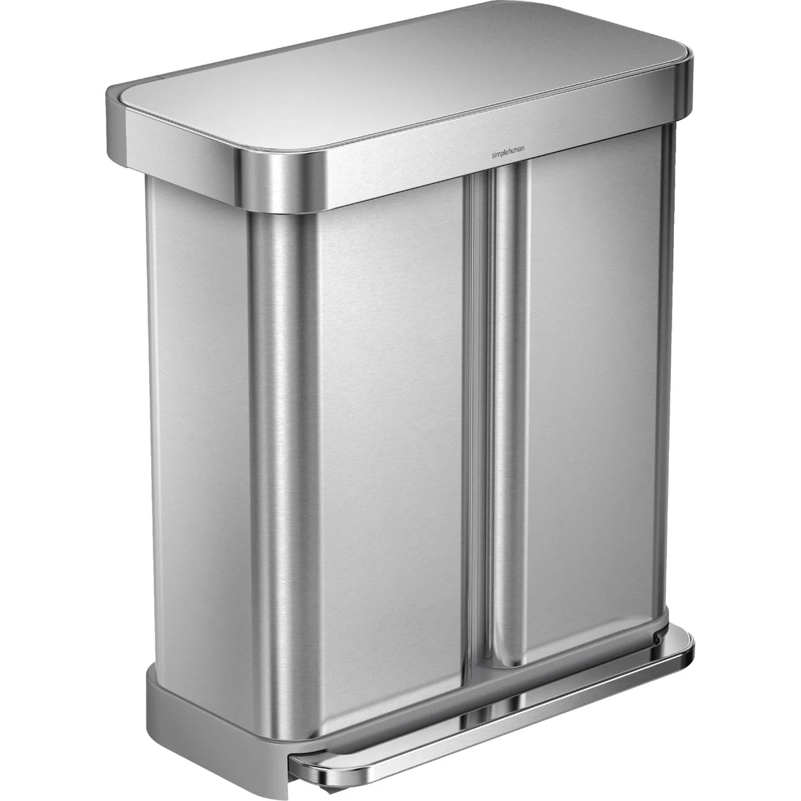 simplehuman’s dual compartment stainless steel rectangular step can makes it easy to neatly sort your trash and recyclables in one convenient, space-efficient space. On one side, it features an innovative ‘liner pocket’ that stores and dispenses liners from inside the can for a faster liner change. The other side has a convenient handled bucket for easy lifting and disposal of all your recyclables. The stainless steel liner rim grips the liner and keeps it hidden. A strong wide steel pedal is designed to last, and the patented lid shox technology ensures a smooth, silent close every time. Code H liner refill packs store perfectly in this can’s liner pocket.