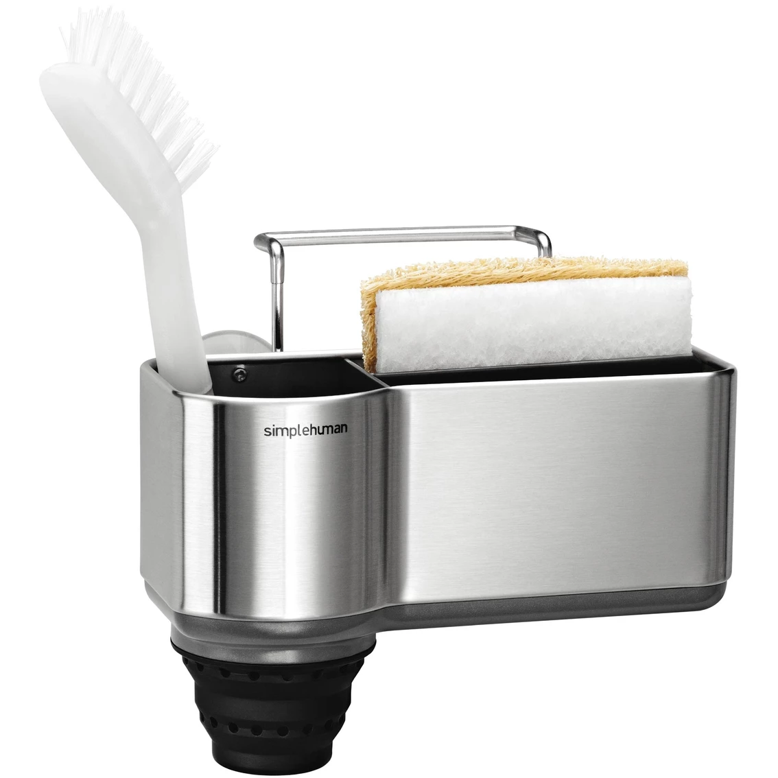 This sink caddy from simplehuman keeps your sink area neat and everything you need within easy reach. Four suction cups and a wire ledge hanger provide a secure, non-slip grip on your sink. Elevated plastic dividers store and organize sponges separately while numerous venting holes maximize airflow to help them dry quickly minimizing bacteria growth. The pop-out silicone brush holder extends to hold longer brushes. This caddy is made of durable, long-lasting materials that won’t rust or discolor. Model: KT1116.