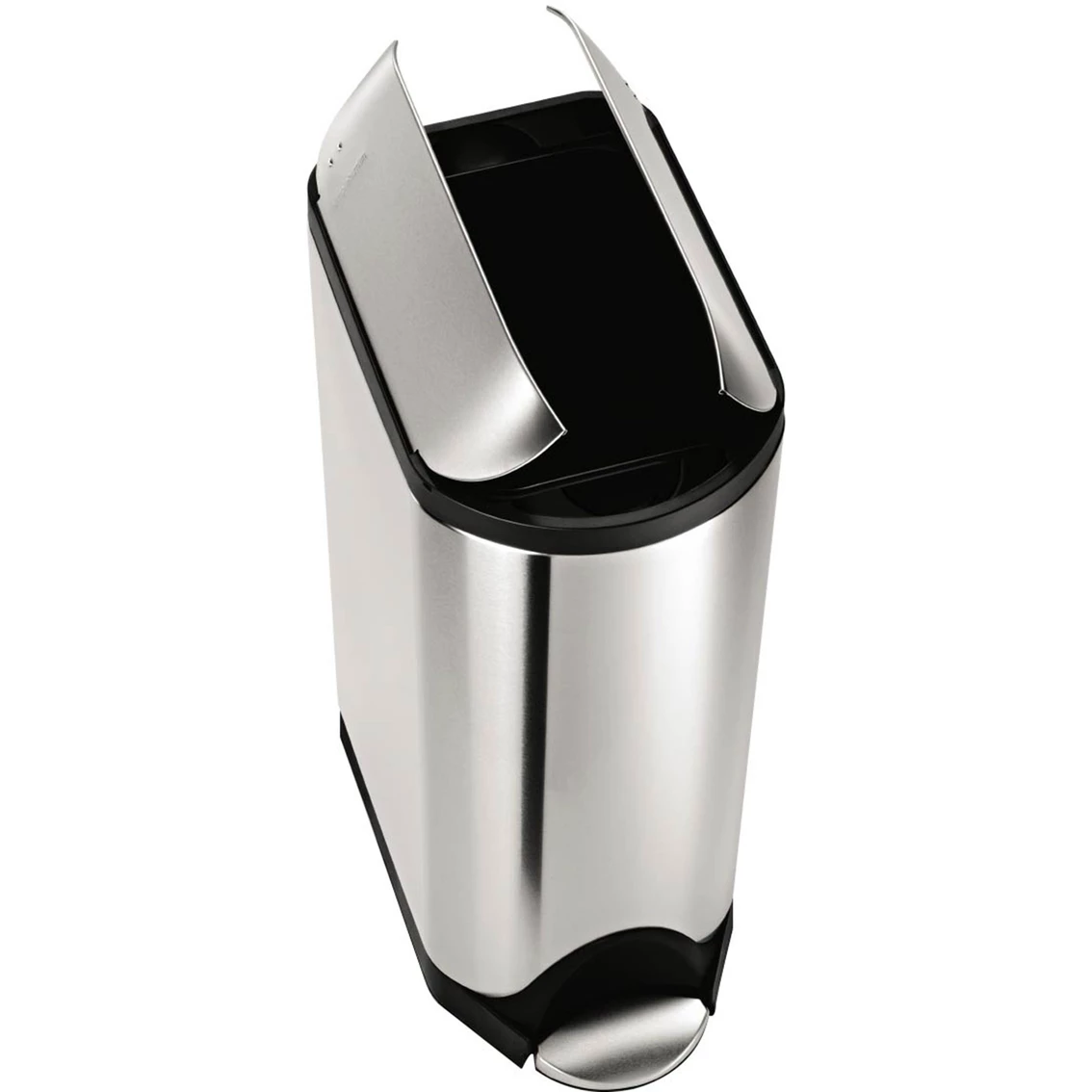 The simplehuman butterfly step trash can has an innovative butterfly lid design that opens from the center for maximum clearance under low countertops. The slim, space-efficient shape makes the most of tight spaces. The strong steel pedal and patented lid shox technology ensure the can will function smoothly and quietly for years. Compatible with simplehuman custom fit code K liner. Model: CW1897