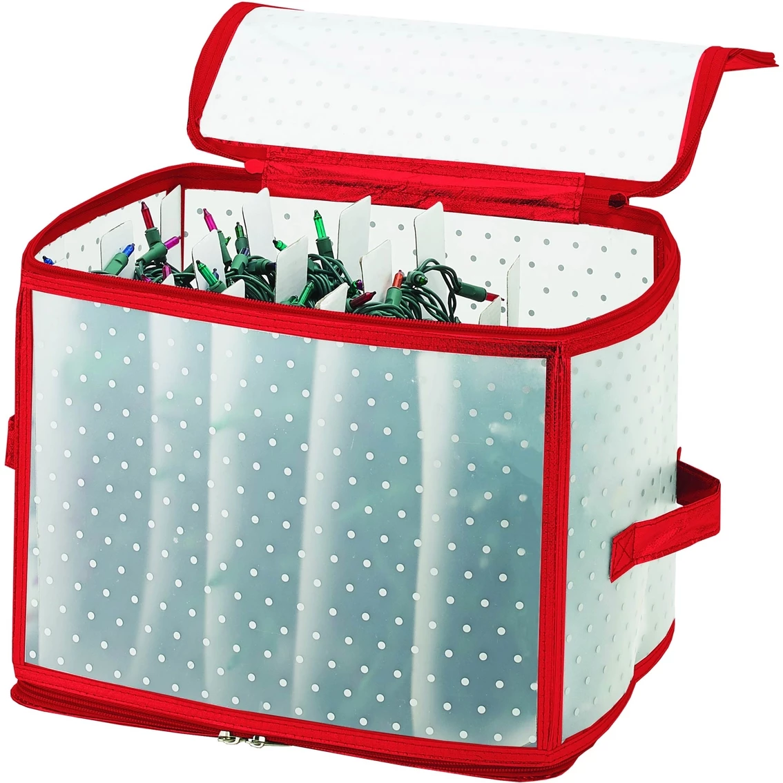 This Simplify Christmas Light Organizer is a great way to keep your Christmas lights organized and safely stowed away to prevent tangling and damage. Handles offer easy carrying and a zipper-lid closure protects from dirt and debris. See through front allows you to view your lights without having to open and go through the storage unit. Doubled sided zippers on the top and bottom of the unit allows for easy access. Model: 9000 RED.