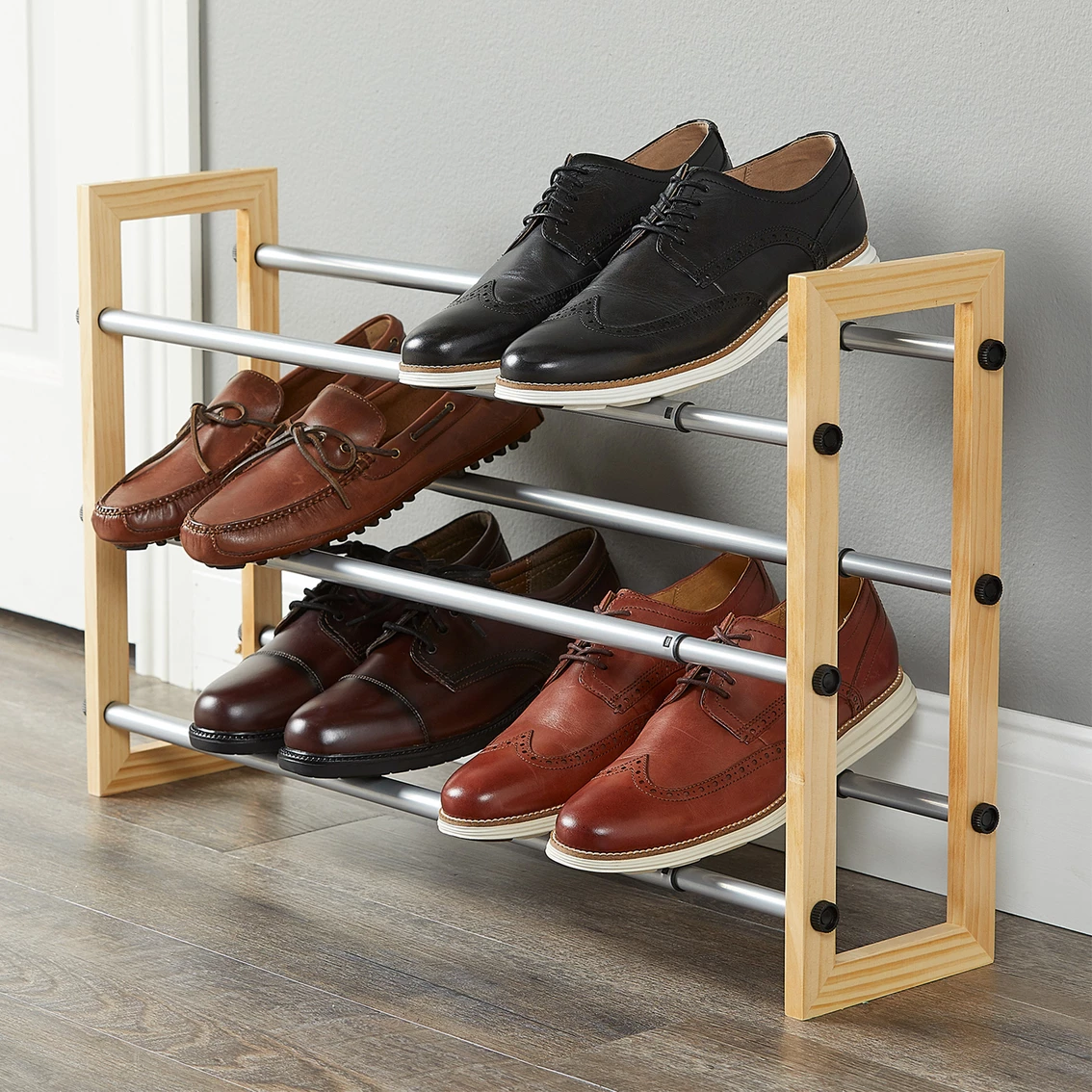 The Simply Perfect Expandable Shoe Rack is the ideal solution to keep your shoes organized. The natural wood frame with powder coated metal support bars expand from 25 to 46 inches and hold up to 18 pairs of shoes. Multiple units can be stacked for additional storage and organization. No tools required for assembly.