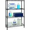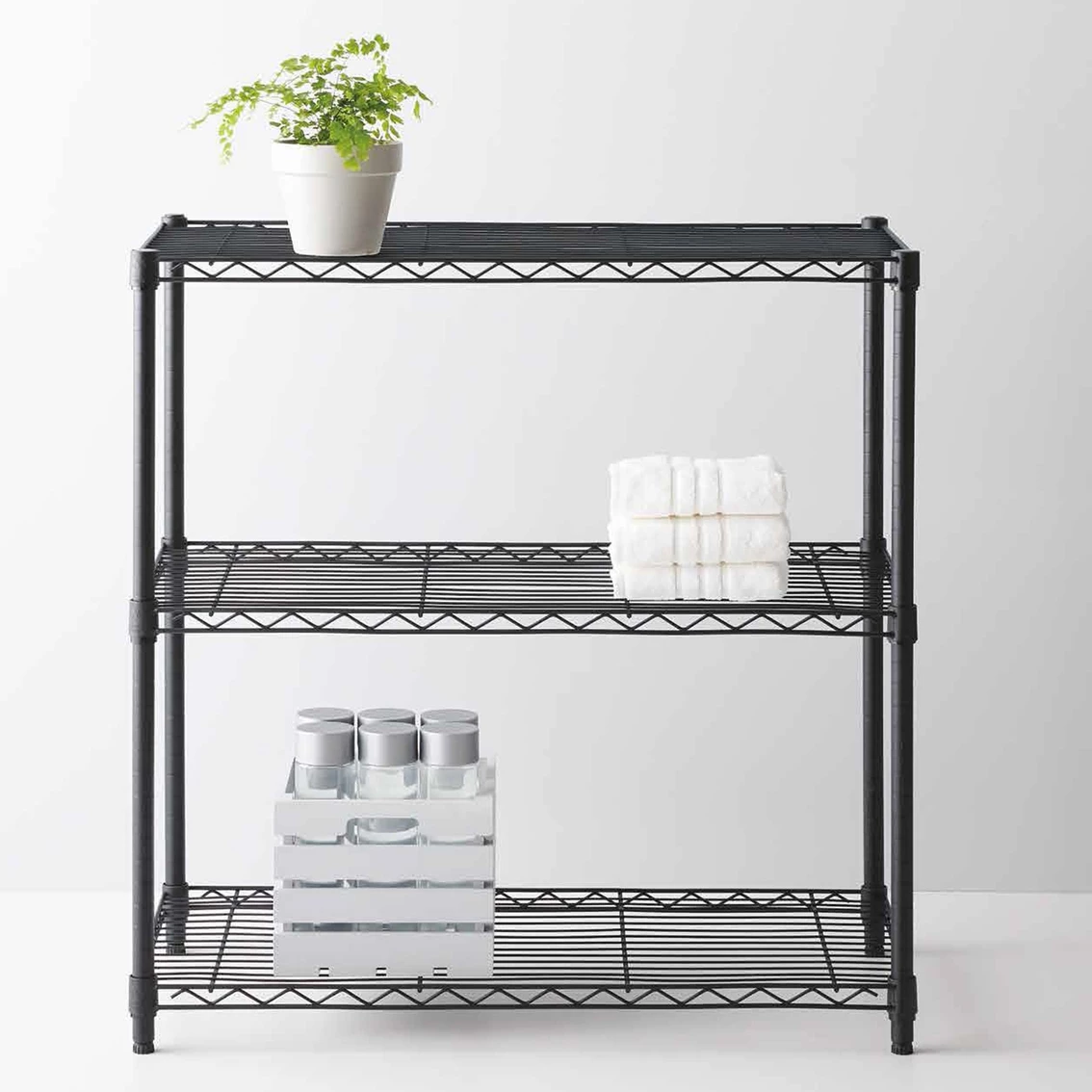 Organize tools, clothes, linen, towels, craft supplies and more with this Simply Perfect wire shelving unit. It provides additonal storage space in your garage, workshop, kitchen, living room, laundry room, or bathroom. Easy assembly, no tools required. Heavy-duty steel construction with grid wire shelves that adjust in 1-inch increments with adjustable leveling feet. NSF approved for industrial or residential use and holds up to 200 pounds per shelf (evenly distributed). Model: LX46T3K.