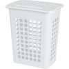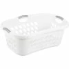 The Sterilite 1.5-Bushel Ultra Square Laundry Basket features a square design that occupies less floor space. The basket offers durable construction and comfortable handles that make transporting clothes to and from the laundry room easy. Model: 12178006.