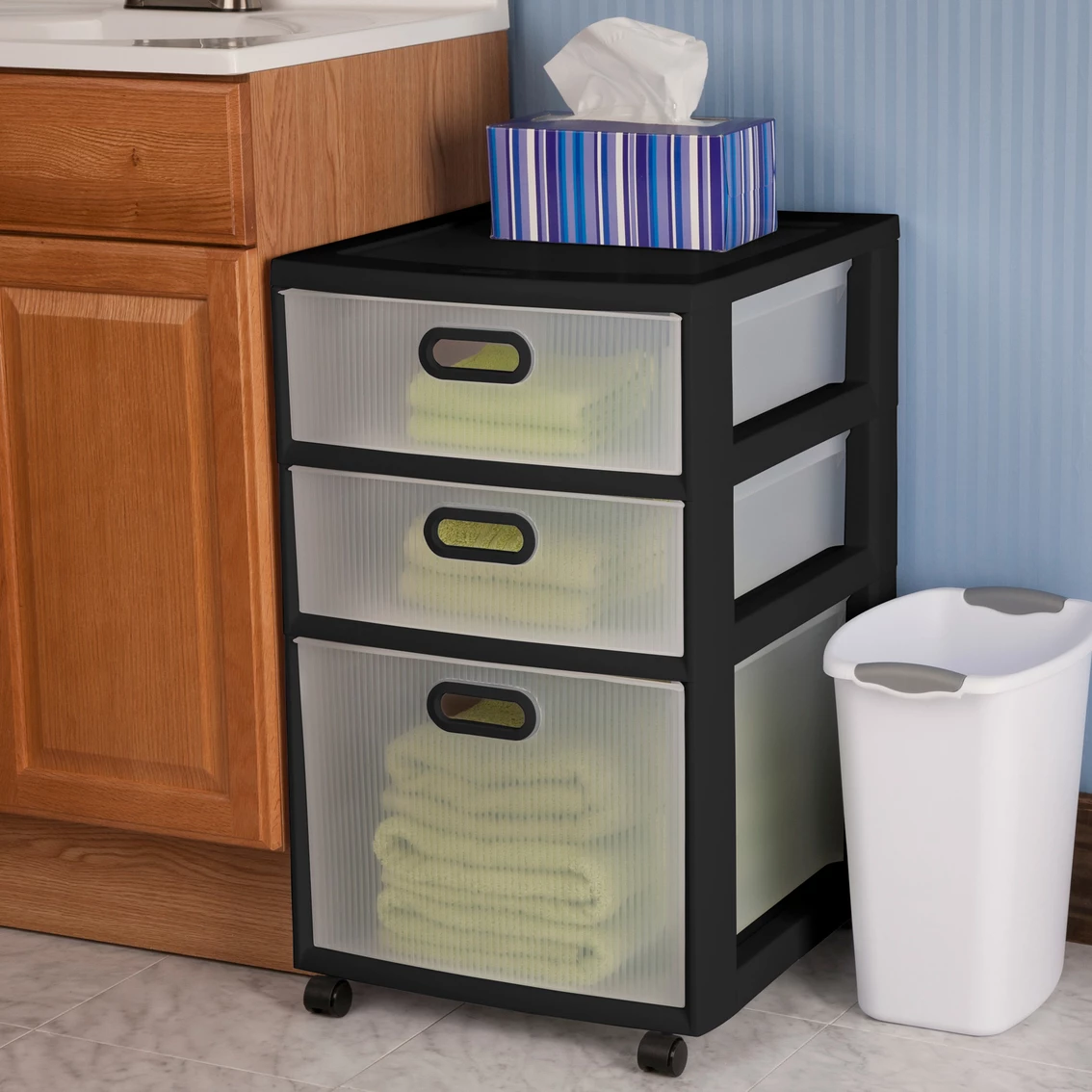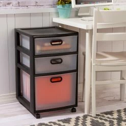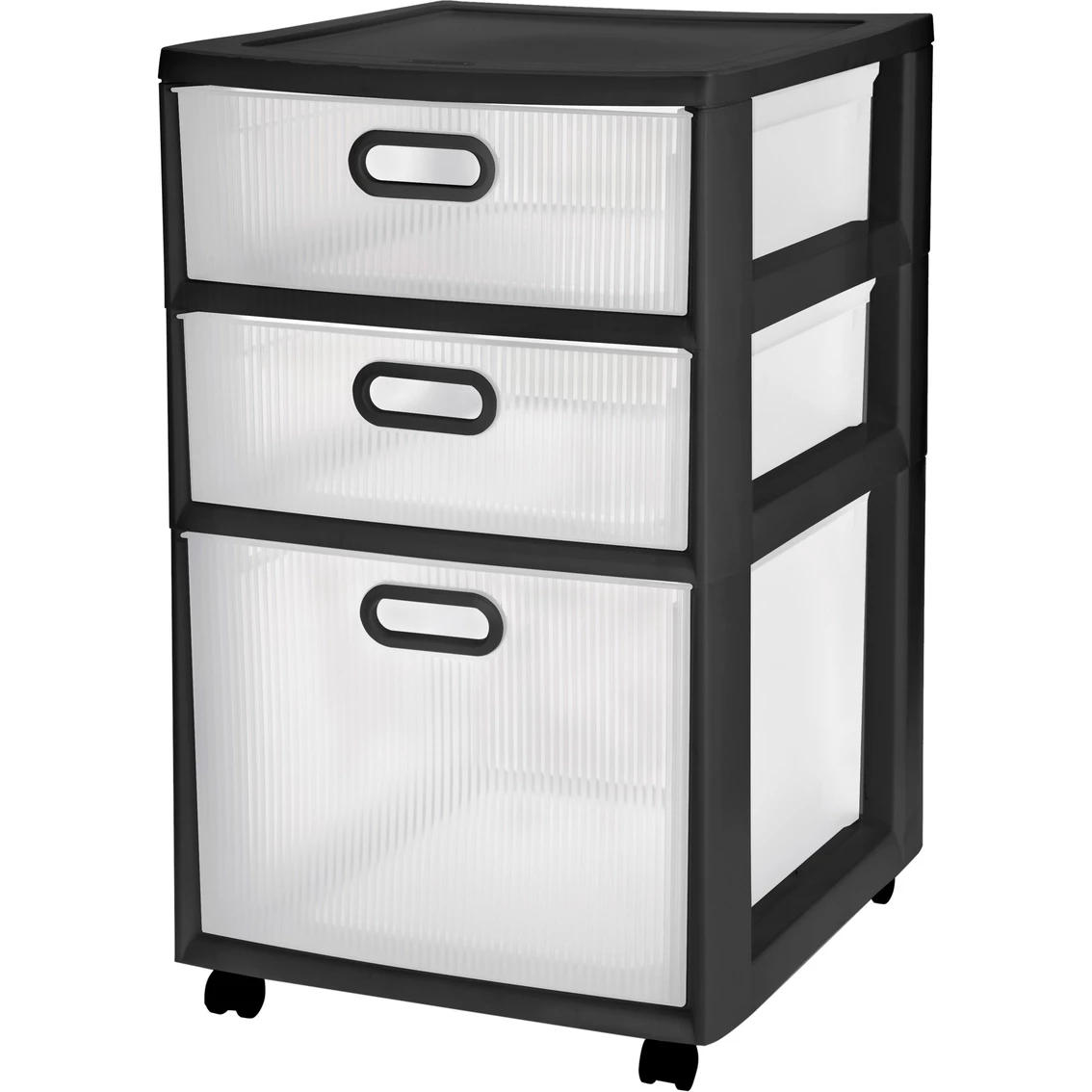 The Sterilite 3 Drawer Ultra Cart accommodates letter sized hanging files to help bring order to your office or home work space. This practical and versatile storage solution features clear, stylized, textured drawer fronts with clear sides that allow items to be quickly identified. The attractive styling makes them an ideal organizing solution for any area around the home including living rooms, bedrooms, offices and more. Keep your files organized and easy to find when neatly hung in the Ultra Cart’s deep drawers. Or use the drawers to keep paper, craft supplies, accessories and office / school supplies contained. Use the included casters to create a rolling storage option and easily move the Drawer Cart wherever it is needed. Style: 36129.
