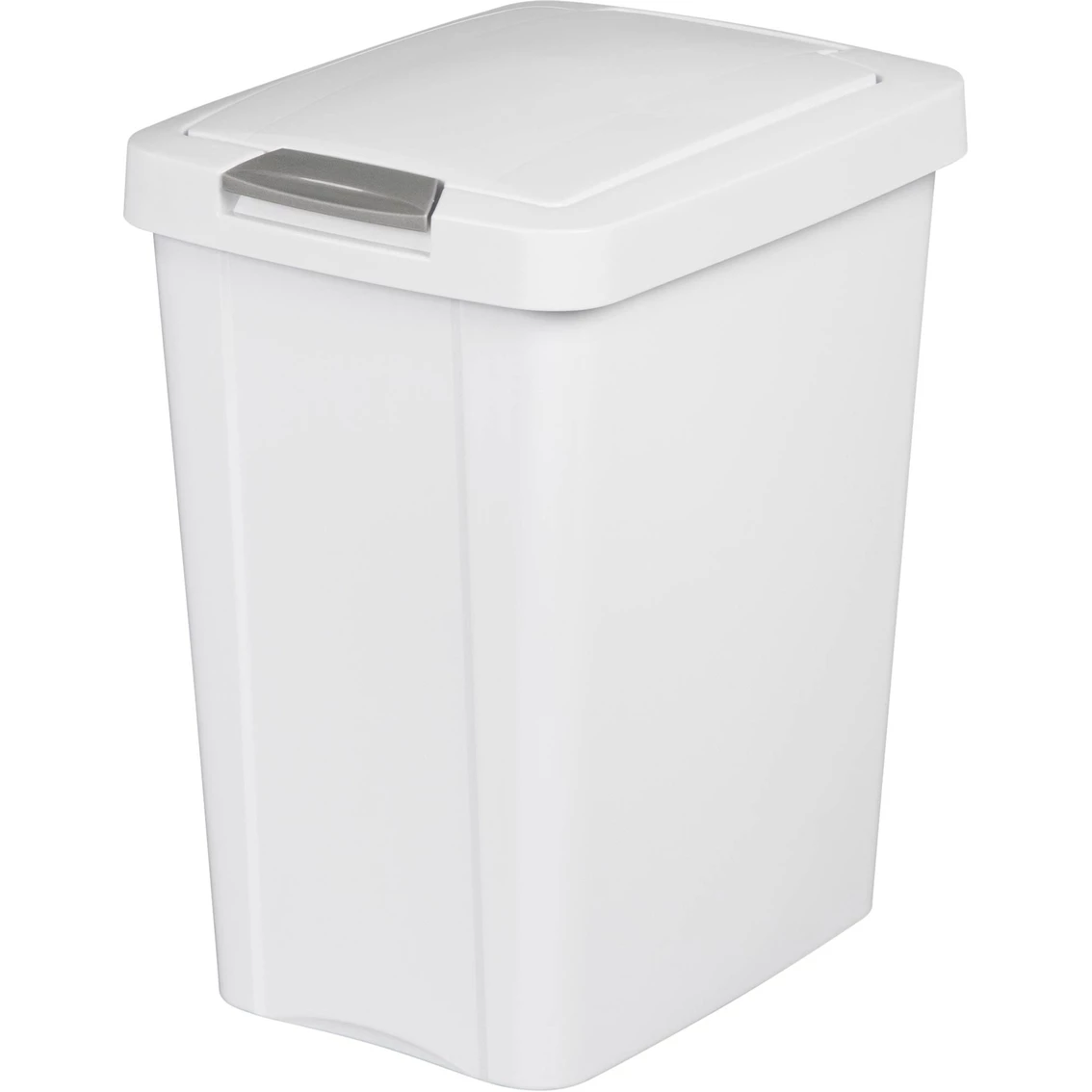 This Sterilite 7.5 gal TouchTop Wastebasket features a sleek profile and polished finish. The slim shape is designed to fit into narrow spaces, and the lid orientation features the latch on the short end of the rectangular base. The TouchTop lid opens with a touch and then shuts securely to keep contents concealed. Style: 10438004.