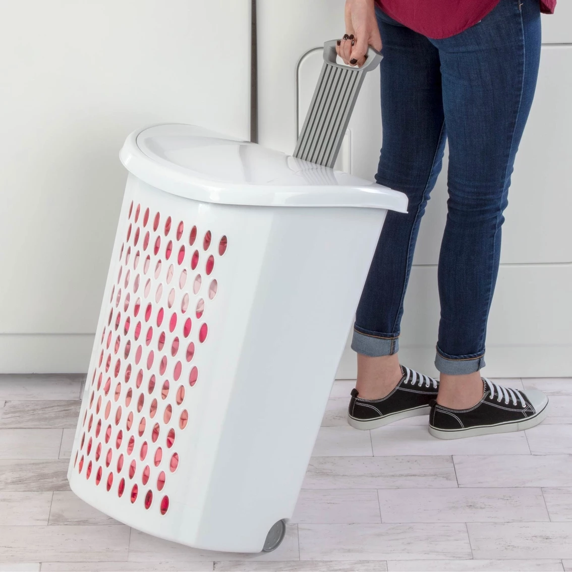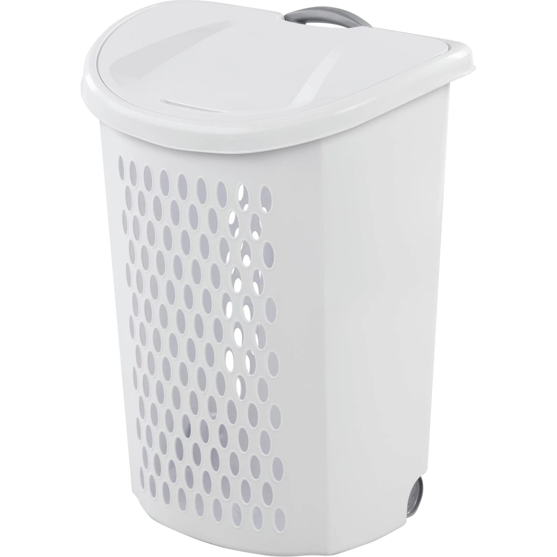 Moving laundry around your home just got easier with the Ultra Wheeled Hamper. It combines a contemporary design with smooth rolling wheels and an ergonomic pull-up handle. Incorporated into the base of the hamper, the wheels move easily across all smooth surfaces, while the handle provides a secure grip that can be pushed down and out of the way when not in use. The combination of these two features help to make trips to the laundry room less of a chore. For situations where the hamper needs to be lifted, integrated handles on each side provide a comfortable gripping surface while the flip-top lid keeps clothes contained and neat. A large, stylish hole pattern keeps everything well ventilated and helps reduce odor. Model: 12278.