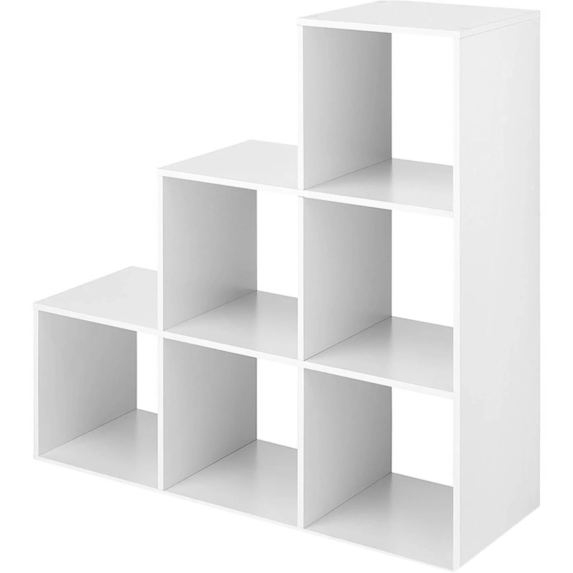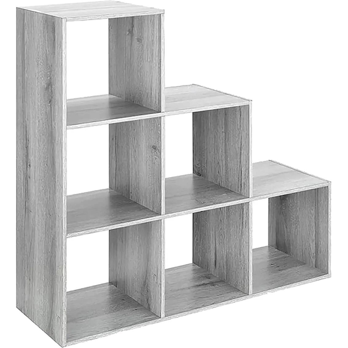 The Whitmor 6-Section Step Organizer is a uniquely designed cube organizer with convenient cube openings for storage. Storage for any space. Can be used facing right or left. Smooth woodgrain laminate finish. Assembly required with hardware included. Model: 6422-9496-WHT.