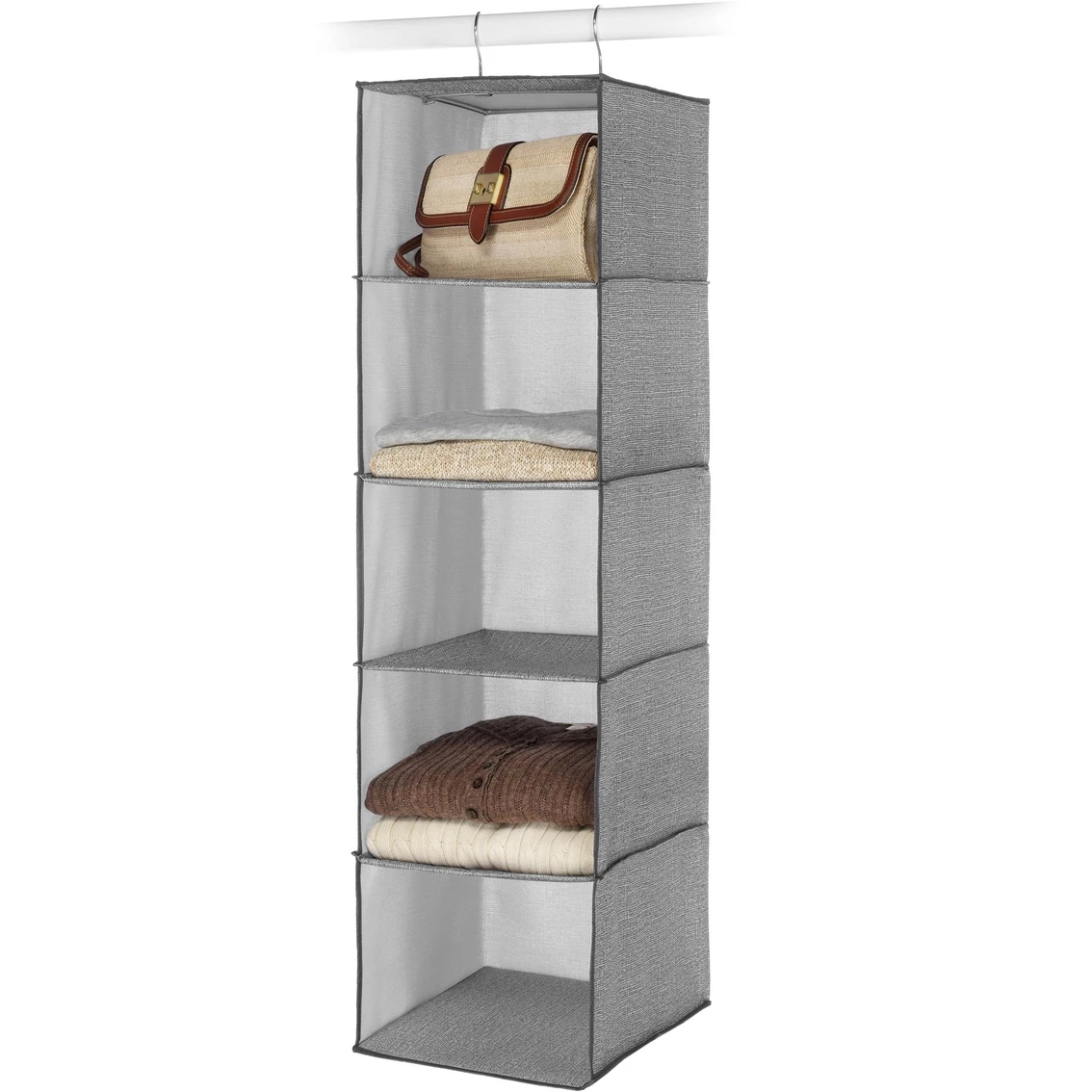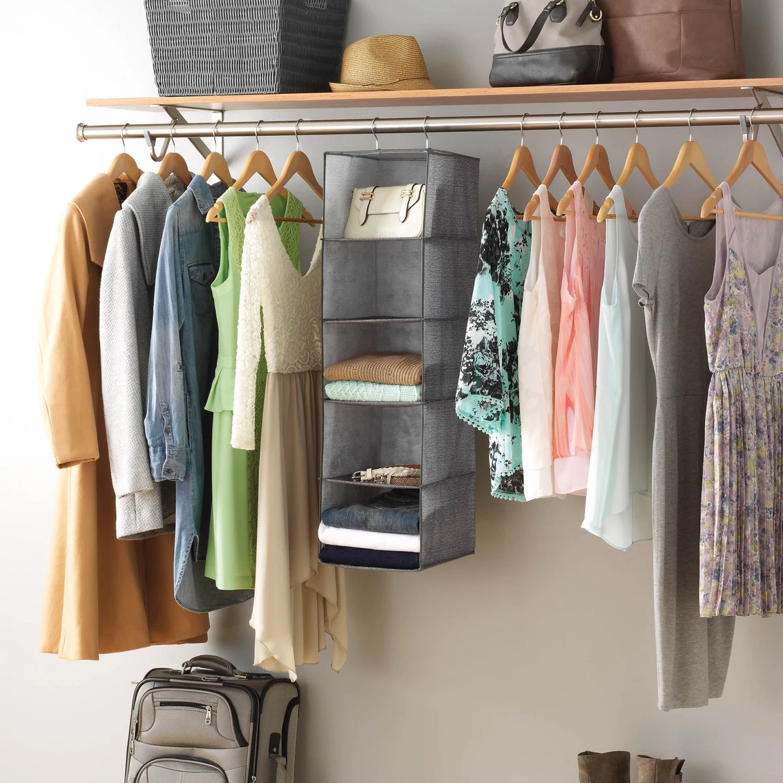 Do you need a visible space for your purse? How about extra space in your closet for your sweaters and pullovers? The Whitmor Hanging Accessory Shelves services these needs. Hang this on a closet rod to minimize the space taken to store accessories and folded apparel. This hanging accessory organizer features 5 medium sized shelves. It is made of durable nonwoven polypropylene and measures 10.8 in. x 10 in. x 35 in. Style: 6283-300.