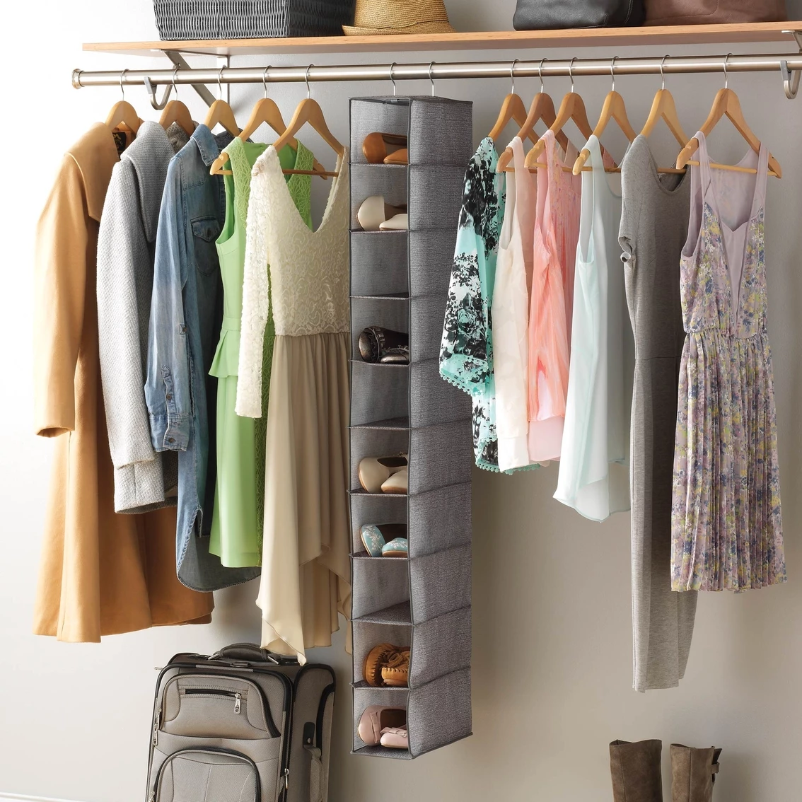 The Whitmor Hanging Shoe Shelves features 10 shelves for shoes or small accessories. Hang this on a closet rod to minimize the space taken to store a shoe and accessories collection. Made of nonwoven polypropylene this sturdy shoe organizer measures 11.5 in. x 5.5 in. x 52 in. Style: 6283-112.