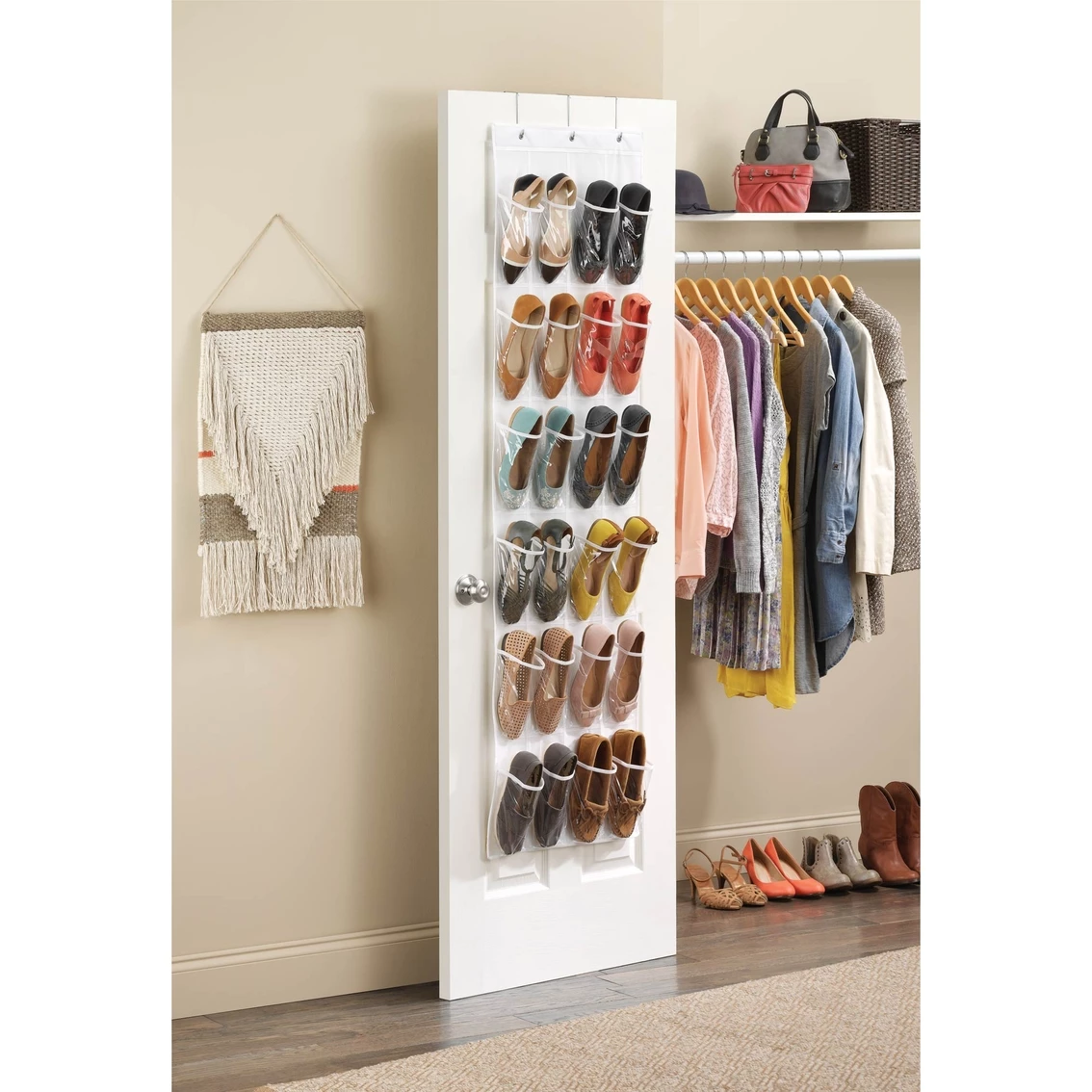 This easy to assemble Over-the-Door Shoe Bag from Whitmor’s White Crystal Collection has 24 clear vinyl pockets to store and protect up to twelve pairs of shoes. Instantly de-clutter your closet or bedroom while also saving your shoes from unwanted damage. This shoe bag is a snap to assemble using the provided hooks and hangs conveniently over standard size doors.
