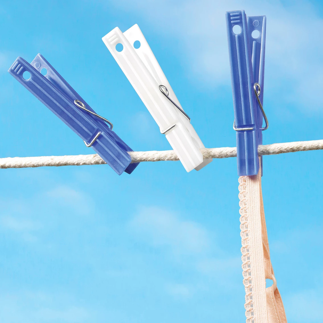 Whitmor’s classic white and blue plastic clothespins are just what you are looking for. These non-staining clothespins feature a heavy duty plastic construction with a sturdy galvanized non rusting wire spring. The no-slip finger grip ends make using these clothespins a breeze. Size: 50. ct.