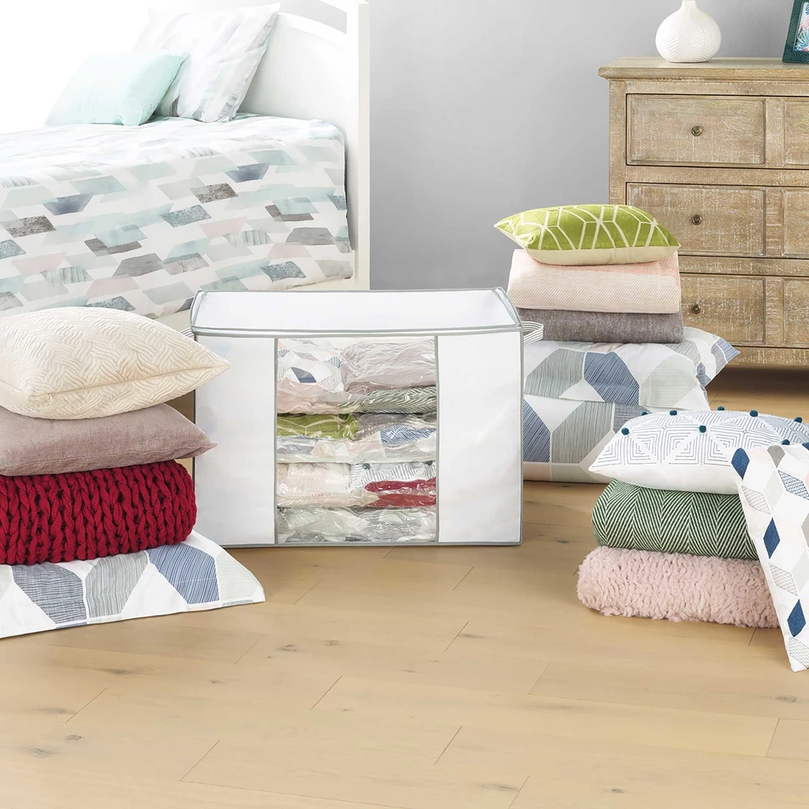 Whitmor’s new valve design has no cap. Other bags rely upon a cap to be tightly sealed to keep air out but air can still seep through the cap causing the bag to deflate overtime. Whitmor’s new technology in our no-cap valve created an airtight harrier keeping items condensed for the long haul. If you do not have a vacuum handy you can compress bags by simply hand-rolling the bag to remove excess air. Increase storage space in your suitcase, luggage or closet. Whitmor is a 4th generation family-owned and operated business. Since 1946, Whitmor has been dedicated to bringing organization home by creating products that simplify everyday life. Ensuring that those products are built with integrity, value, and innovation is our commitment to you. And our promise is that we will always be here for you should you ever need us as we stand behind our product 100%. Model: 6115-11661-CB.