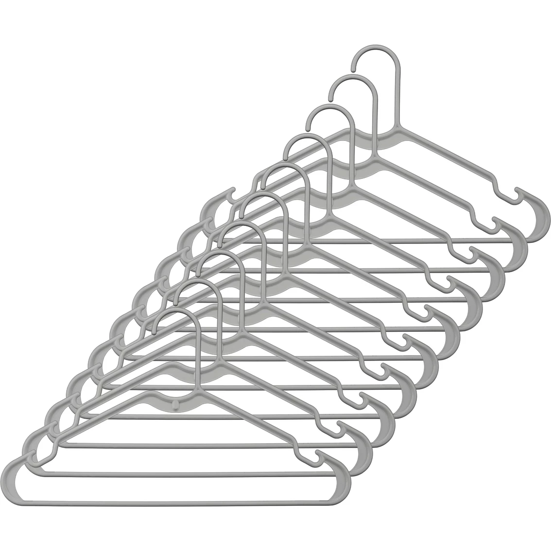 Made from durable, molded plastic, the Whitmor Set of 10 Tubular Plastic Hangers feature an off-center hook that prevents necklines from stretching. Each hanger features a ribbed pant bar to eliminate slipping off the hanger and and the hanger’s notched shoulders help keep garments in place. Includes 10 hangers.